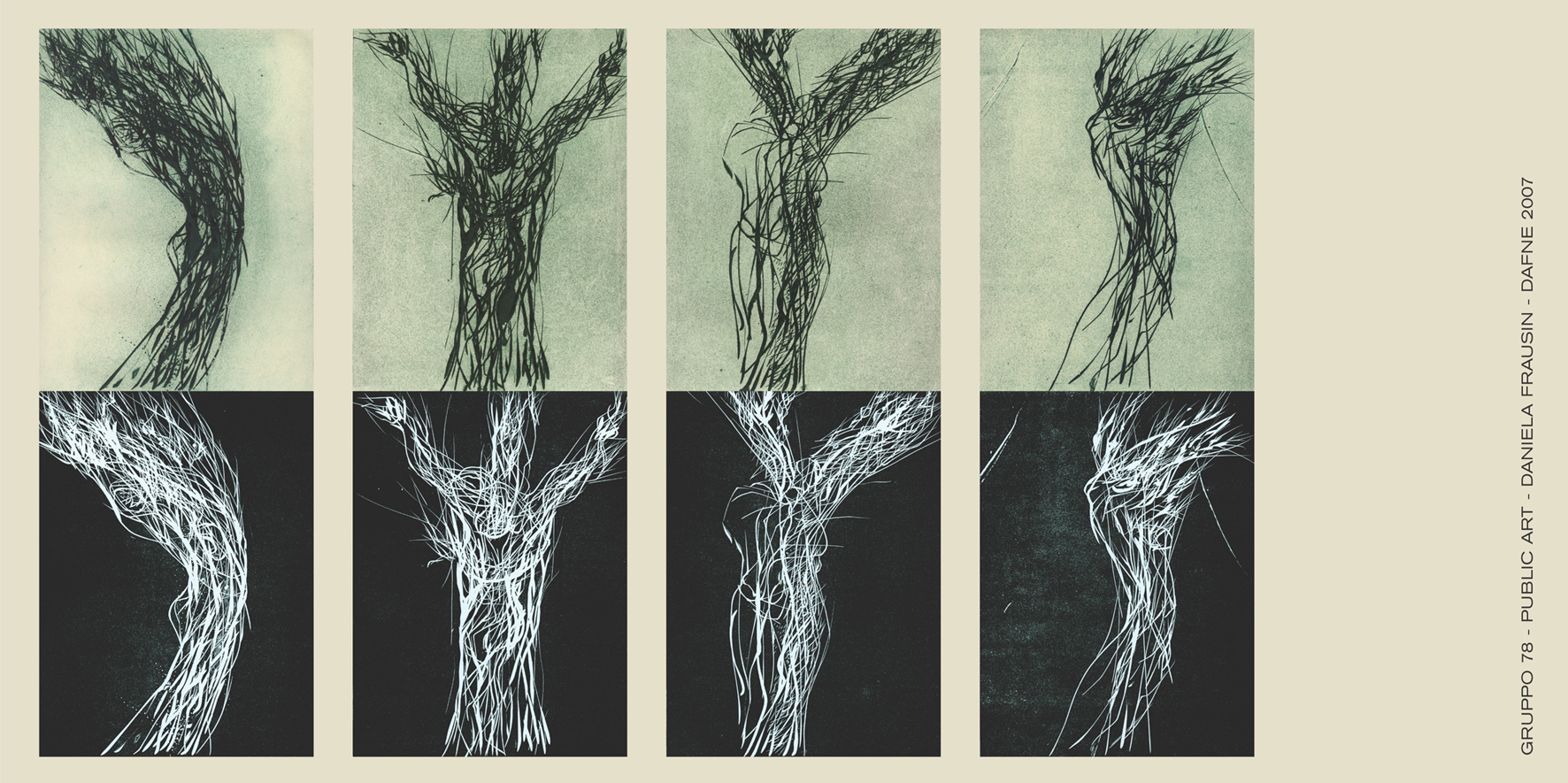 Di tutt’altra natura il progetto di Daniela Frausin che parte dal suo recente discorso segnico, affidato per lo più alle tecniche incisorie. Un segno iterato, fluido e sicuro, che ingigantito nelle dimensioni del poster acquista una straordinaria forza propulsiva. Anche qui, in una personalissima visione aniconica, prevale l’idea del dinamismo, del movimento irruento che produce trasformazione e contiene in nuce la spinta travolgente della danza. Il tema infatti è “Dafne”, iterata in diversi momenti, e in duplice versione a fondo chiaro e a fondo scuro, curiosa metamorfosi di radice mitica, esposta stranamente allo sguardo curioso o frettoloso di passanti e automobilisti.