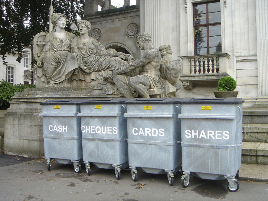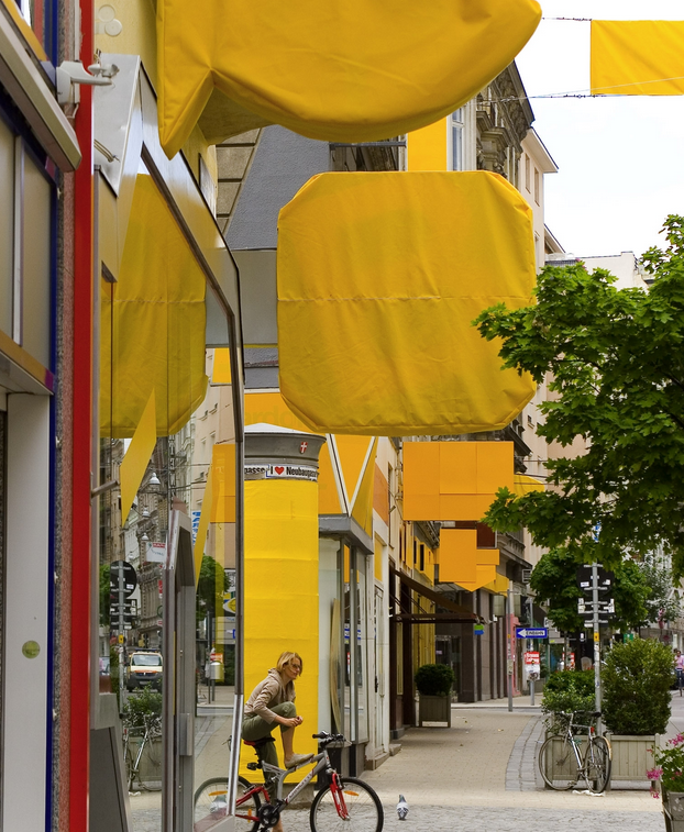 Il duo Steinbrener – Dempf di Vienna, opera sul territorio urbano, inseguendo dunque il rapporto arte/città. Di grande efficacia l’intervento “Delete” – realizzato nell’estate 2005, al settimo distretto, e qui documentato – con la sparizione, per due settimane, di tutte le insegne, pubblicità, slogans, che costituiscono il tessuto semiotico di un’arteria cittadina. Ovvero azzeramento dell’assordante, insistente comunicazione commerciale che, nell’onnipresenza e nell’iterazione, si vanifica comunque nella ricezione del cittadino. Due inaspettate settimane di silenzio, con le insegne imbavagliate dal tessuto giallo, che in ogni caso propongono una nuova lettura di quella strada. Anche l’altra coppia di artisti, i fratelli Maik e Dirk Loebbert, interviene sull’architettura e l’ambiente urbano. Le foto tratte dal progetto “Anonymus” documentano una curiosa operazione: quella di citazioni di interni, dislocati però su percorsi pubblici, come “Gardarobe”, ”Dressing Room”…realizzati con il recupero di oggetti di scarto, nel concetto dunque del riciclo. Mini-installazioni, abbandonate poi a se stesse, soggette al logorio del tempo e alla naturale decomposizione.