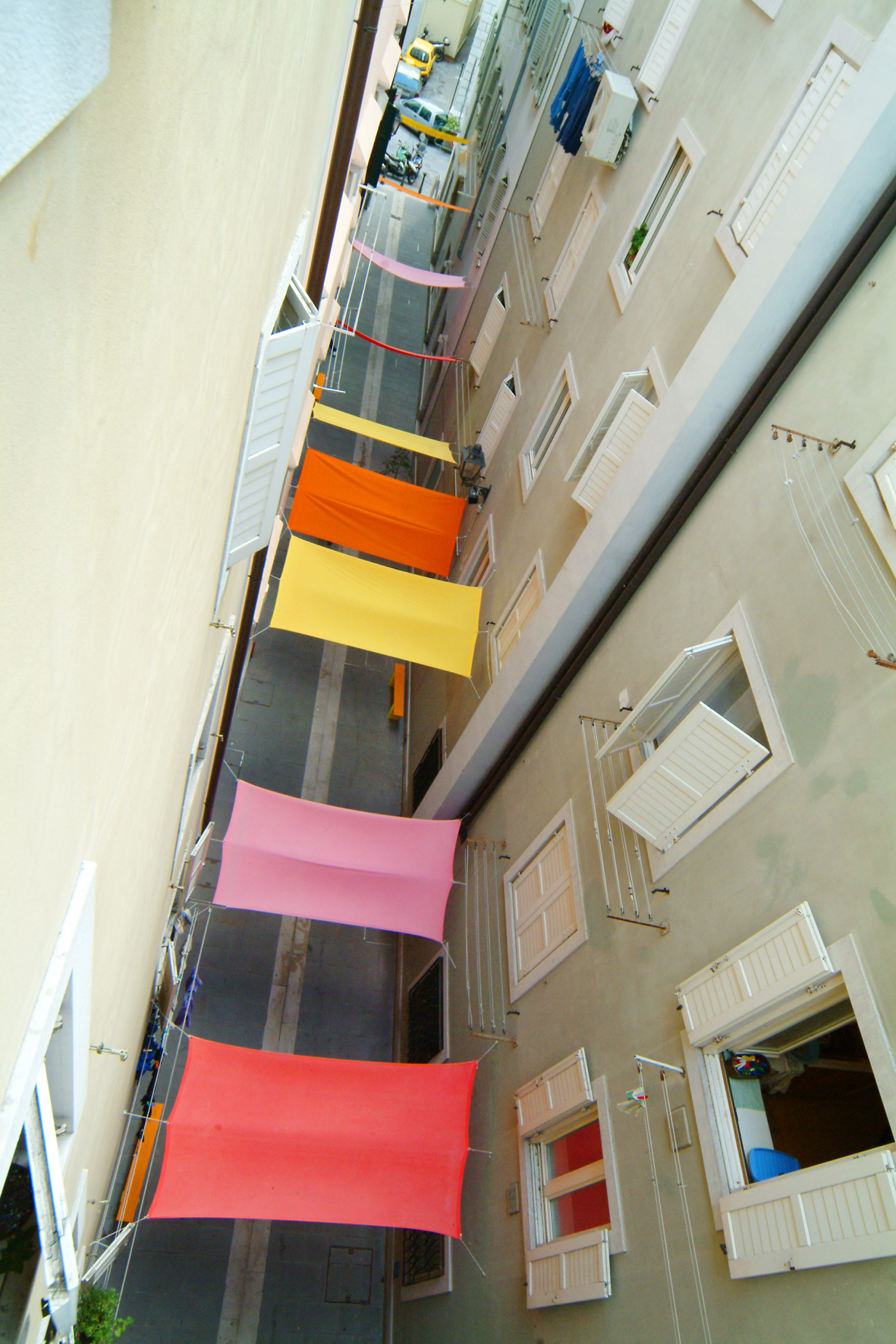 Elisa Vladilo infine conclude questo ciclo espositivo con una serie di lavori legati a varie esperienze, dalla casa, luogo di una residenza artistica a Sinj Vrh (Slovenia) trasformata in virtù della quadratura coloratissima disposta in facciata, alla recente “pioggia di musica in via delle ombrelle”, con tele variopinte tirate da un estremo all’altro della strada, dalle “striscie pedonali rosa” realizzate a Genova, all’intervento all’interno della Fabbrica del Vapore a Milano. Colori e gioco, secondo la sua consuetudine, irrompono nei luoghi prescelti, rianimandoli, riversando in loro veramente nuova linfa vitale.