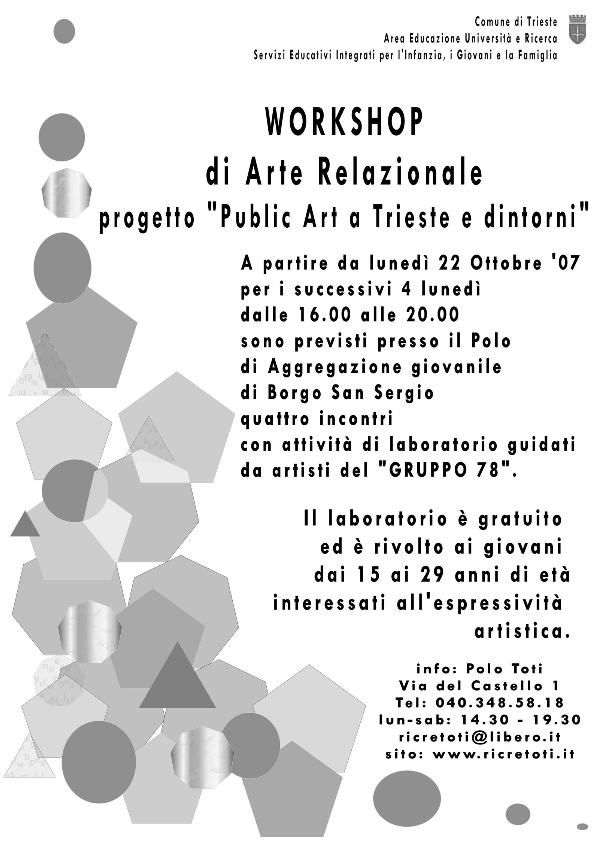 A seguito delle riunioni presso l’Assessorato e presso il Polo comunale di aggregazione giovanile “Toti”, e in relazione agli spunti emersi, il GRUPPO 78 propone di inserire nel contesto della manifestazione “PUBLIC ART A TRIESTE E DINTORNI” che si svolgerà a Trieste dall’11 giugno all’11 novembre 2007, in collaborazione con l’Assessorato all’Educazione, Infanzia, Giovani, Università e Ricerca, Servizi Educativi integrati per l’Infanzia i Giovanie la Famiglia – Poli dell’Aggregazione Giovanile del Comune di Trieste, un possibile intervento con finalità creative ed educative rivolto ai giovani, nella fascia di età dai 16 ai 26 anni, che frequentano i Poli comunali di aggregazione giovanile.