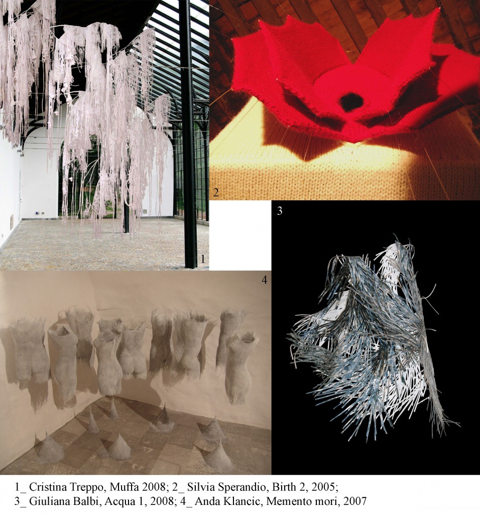 Da queste modalità – che emergono dall’universo femminile e che riecheggiano pratiche del quotidiano, un’aura domestica, attinenza al corpo, – prorompono i temi universali della vita, nella sua fragilità, e della morte; della gravidanza e del dolore, dei percorsi del pensiero (“le cappelle di meditazione” di Anda Klancic), e dell’elevazione dell’anima purificata dall’acqua, dell’inesorabile trascorrere del tempo, e della conseguente modificazione della natura e delle cose…