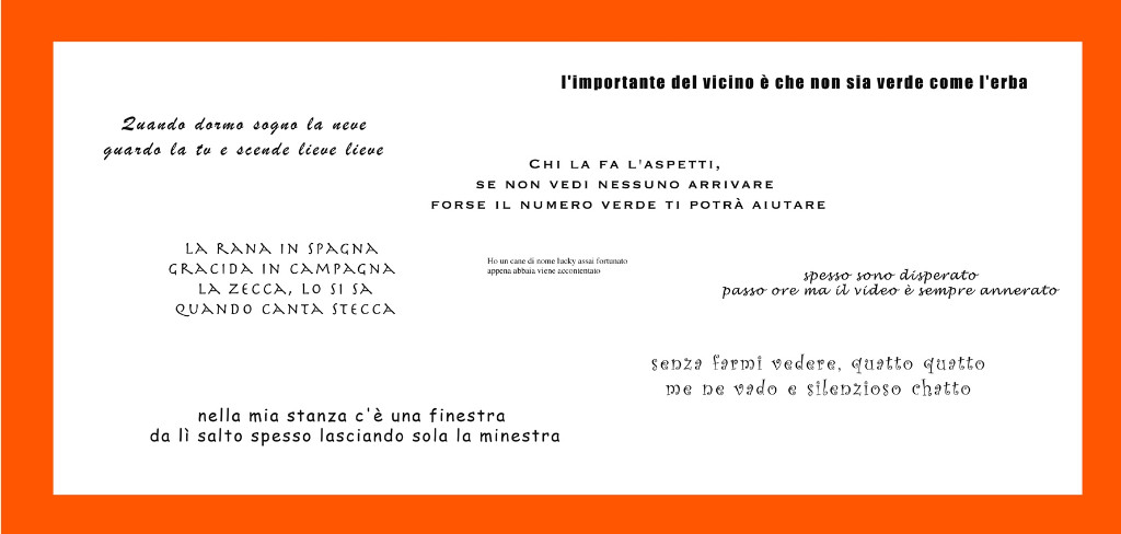 Roberto Dedenaro ha compilato invece un manifesto dal titolo “Pro-verbis”, giocando ovviamente sulla parola dal momento che questo è il suo terreno di comunicazione, “Un manifesto per la comunicazione etica” dichiara l’autore. Si propone infatti “un uso della parola innocente (al contrario di quella pubblicitaria) infantile, stralunando – nel senso della luna nel pozzo – alcuni sgangherati sensi comuni”. E’ in sostanza un gioco di spostamenti di parole e, di conseguenza, di significati, come uno scherzo da bambini che si divertono a stravolgere il senso delle cose puntando all’assurdo, al risibile, come ad esempio “l’importante del vicino è che non sia verde come il prato”.“E’ anche un invito – sottolinea l’autore – ad un rapporto creativo con le parole e con la morale stantia da parte dei passanti che possono continuare a inventare comunicazioni… demenzialmente”. L’impaginazione grafica – ogni espressione comporta un carattere diverso – è di Elisa Vladilo.