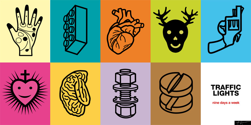 “Traffic_lights”, nove giorni alla settimana, questo il titolo del manifesto di Adriano Gon, da subito, con quei nove giorni alla settimana, spiazzante, con l’intento di confondere lo spettatore . Il quale però si trova coinvolto dai nove nitidi segnali/semafori inquadrati in altrettante caselle, come un piccolo abbecedario, secondo l’intento dell’autore. È un lavoro che ha origini lontane, configurandosi in ogni caso come arredo urbano. L’idea è nata nel 2007 con dei lavori esposti a Noja in Cantabria (Spagna) ora aggiornati per questa occasione triestina. Lo spunto discende da un articolo di alcuni anni fa in cui si indaga l’evoluzione del sistema di comunicazione cittadina, nei suoi codici, regole, moduli. La città è un tessuto attraversato da innumerevoli segni, sistemi segnaletici, messaggi, “si configura come un discorso composto da innumerevoli tratti minimi significanti, tanto che una sua lettura richiede una grammatica generale di riferimento…lo scenario cittadino veicola significati che mutano nel tempo e nelle circostanze”. Adriano Gon con i suoi “traffic_lights” si inserisce in questo contesto, distribuendo però segnali che non riguardano il traffico della città, o le sue insegne promozionali, bensì “un catalogo di sensazioni e codici propri del puro territorio umano”. Non orientamenti per il corretto movimento nella città, ma segnali che riguardano la nostra vita quotidiana, le “percezioni che la popolano”, fondandosi su segni semplici, dai contorni decisi, dai colori saturi, semplificati nella forma, come nelle procedure linguistiche da design. Un cuore, pastiglie, un cervello, una mano con le grafie per la sua lettura, un sacro cuore che sorride, un teschio furbesco con le corna…