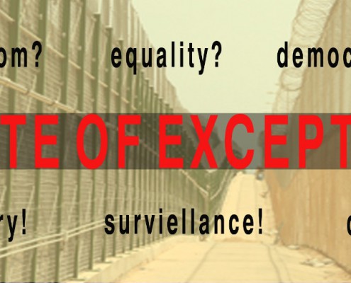 Sebastjan Leban e Stas Kleindienst propongono un manifesto di natura politica, dal titolo “State of Exception”. E’ una riflessione, in termini visivi, sulla situazione dei migranti nei confronti degli stati dell’UE in cui aspirano ad approdare e ad inserirsi. E’ una constatazione della diversità tra condizione interna degli stati ed esterna lungo i confini, che i migranti si trovano ad attraversare per lo più illegalmente. Dice l’artista: “la protezione di libertà e democrazia produce un prezzo che non viene pagato dai cittadini dell’Unione Europea – questo primo tentativo di formare un’Europa unita – ma da tutti quelli che vi voglio entrare in forma illegale”. C’è dunque un contrasto tra l’aspetto positivo, di successo e vitalità, all’interno dell’Unione e la realtà di morte, rovina, fili spinati con cui l’Unione stessa cerca di prevenire l’attraversamento illecito dei confini. Questo pensiero si condensa criticamente nella configurazione di “State of Exception”; lo stato d’eccezione è stabilizzato ai confini dell’Unione Europea. Nel manifesto alla domanda “freedom, democracy, equality (le parole sono seguite da un punto interrogativo e appartengono alla realtà dell’Unione) – si contrappongono le collaterali conseguenze : “slavery, surveillance, death” riservata al mondo degli extracomunitari. Il tutto sullo sfondo di una strada impervia recintata da muri di protezione e filo spinato.