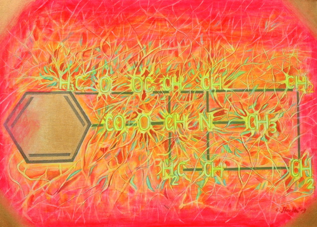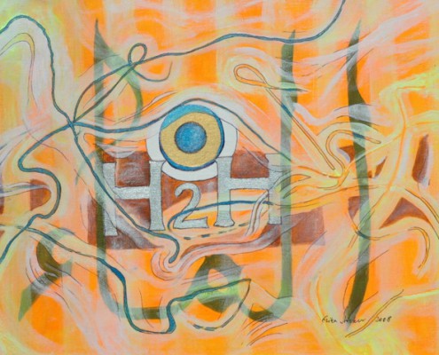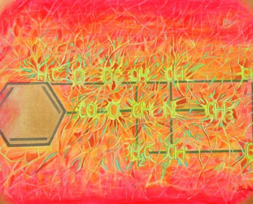 La mostra poi si articolerà con le opere di alcuni cicli recenti cui l’artista oggi si dedica. E cioè saranno presentati alcuni dipinti del ciclo del ballo (attività, secondo la neuroscienza, di primaria importanza per il buon mantenimento delle facoltà psichiche oltre che fisiche), delle formule chimiche (che contengono anche le icone del male perché si riferiscono a sostanze nocive alla salute dell’uomo), dell’acqua. Per ognuno di questi cicli si tratta di visualizzazioni di concrete realtà tradotte, attraverso il pensiero e la viva sensibilità dell’artista, in sintetiche astrazioni (come i passi e i ritmi dei balli popolari greci); di simboli scientifici espansi in cromie e segni di fantasiosa bellezza.