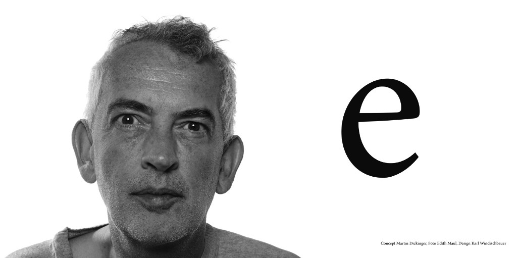 Martin Dickinger ha scelto il b/n per costruire un’immagine che osservi l’Italia. Ed è lui stesso che l’osserva, con il suo ritratto ingigantito, lo sguardo intenso e brillante, le labbra atteggiate ad un lieve sorriso. Un’espressione vivace e partecipe, che contiene e trasmette energia. Infatti accanto a lui c’è una grande “e” che si può interpretare appunto come “energia”, ma anche come una congiunzione sospesa, come se, accanto all’energia si potessero aggiungere tante altre cose. Il titolo del manifesto si ferma proprio su questa “e” lievitante nell’aria. E’ un discorso aperto, non concluso, in cui si possono innestare i pensieri e le osservazioni più disparate, un accennare e non dire, scegliendo di proposito di non dire, lasciando sottese le cose che potrebbero scaturire…