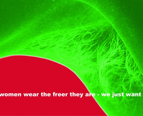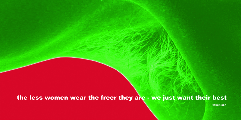 Uli Vonbank Schedler si rivolge invece alle donne. Ha scelto i colori della bandiera italiana: bianco, rosso, verde, colori saturi nella loro complementarietà, come nella bandiera. Il titolo del suo manifesto è infatti “Italienisch”. L’immagine è concreta ed astratta nello stesso tempo, in quanto allude a particolari corporei, in gradazioni di verde, astraendo dall’interezza del corpo, e innestandoli nel rosso intenso dello sfondo che, visivamente si equipara alle estese campiture verdi del corpo. Si crea in sostanza un’ambiguità visiva che trova la sua ragion d’essere all’interno della creatività e della sua autonomia linguistica. Sull’immagine campeggia una grande didascalia bianca che inneggia alla libertà ed auspica il maggior bene possibile per le donne. Un manifesto/auspicio che rispetta le regole compositive del grande placcato all’aperto.