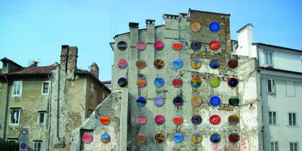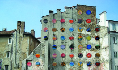 Il manifesto di Giancarlo Venuto è d’altra natura. Non insiste sul linguaggio, offre una grande immagine di una parte di Città Vecchia. Non è un omaggio a Trieste, è un progetto d’intervento pittorico (l’artista pratica come linguaggio fondamentale la pittura) sui muri spogli di via del Forno, muri di risega di case abbattute nei lontani anni ’30. L’immagine fa parte del progetto “La città radiosa” e difatti ne conserva il titolo. L’artista immagina di animare questo muro morto con una serie di tondi colorati con le sfumature, le vibrazioni e le variazioni di cui la sua pittura di norma è intrisa. E’un progetto di arte pubblica, che qui autoproponendosi diviene manifesto, conservando quasi le caratteristiche pubblicitarie del manifesto tradizionale, seppure trapiantate su un altro versante, quello dell’invenzione artistica che aspira al miglioramento di determinate realtà architettoniche.