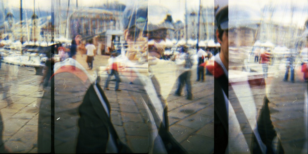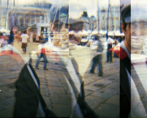 Enzo Comin, col suo manifesto fa un omaggio a Trieste. Comin è un fotografo di ricerca, i suoi album contengono immagini trattate, graffiate, con sovrapposizioni, che nel complesso aspirano alla pittura. L’immagine qui proposta, interamente su pellicola, è composita ed è tratta dalla seria “Tempi visti”. Cioè la scansione temporale s’innesta nella visione: è un vedere nel tempo. Più vedute s’intersecano e sovrappongono. Sono tagli delle rive di Trieste con un ragazzo in primo piano che le percorre ; le immagini, il ragazzo, il selciato, gli edifici dello sfondo, si ripetono più volte, si innestano l’uno nell’altro, è una somma di scatti che registrano l’atto del vedere sciorinato in diversi momenti, fusi in un’unica veduta complessiva.