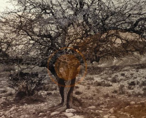 Manolo Cocho, messicano, già approdato la scorsa primavera al Museo Carà di Muggia con una prestigiosa personale intitolata “geografica”, ribadisce il suo interesse e la sua ricerca simbiotica con la natura. E’ un enorme albero il suo manifesto, dalla corteccia rugosa, frastagliato nella sua architettura sapientemente ramificata, accompagnato da simboli della ragione umana, l’alfa e l’omega/cerchio, il triangolo, che sottendono la lettura scientifica/filosofica del mondo circostante. L’arte di Manolo nasce e gravita sulla terra collocandosi in una dimensione universale. I segni della terra si riscoprono dentro di noi dimostrando una simmetria speculare tra coscienza e mondo esterno. La percezione del mondo forma la coscienza e la coscienza crea il mondo. Il titolo del testo che l’artista ha scritto per il suo libro “geografica” suona “come è sopra così è sotto” evidenziando questa specularità del dentro/fuori. E’ un artista che vive spesso nel deserto cogliendone il respiro e il ritmo dilatato, riallacciandosi alle antiche culture che hanno animato il Messico, recuperandone i segni nel suo lavoro. Questo albero maestoso e rinsecchito, che si erge tra petraie e bassi cespugli, è un segno della natura in quel contesto, una testimonianza di un processo vitale che alligna nella solitudine e nel silenzio, prediletti dall’artista in contrapposizione al frastuono metropolitano. Ad esso corrisponde un sentire ed un pensiero che lo compenetrano.
