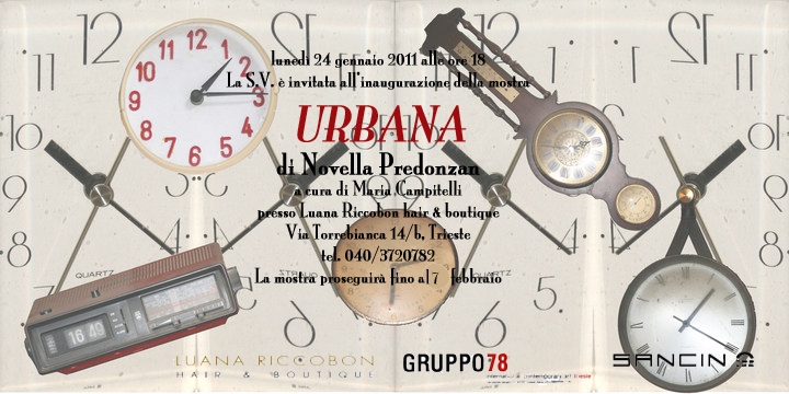 Lunedì 24 gennaio 2011 s’inaugura, alle ore 18, la mostra URBANA di NOVELLA PREDONZAN presso Luana Riccobon hair & boutique, in via Torrebianca 14/b, a Trieste. La mostra è curata da Maria Campitelli in collaborazione con il GRUPPO78.