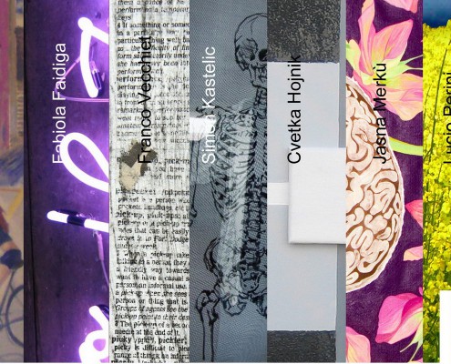 Elisabetta Bacci, con una gigantografia, ha contrapposto due persone di madrelingua diversa intervallate dall’interrogativo “kaj pomeni/cosa significa?” e così Lucio Perini con due diverse gigantografie ha evidenziato la curiosa ambiguità di un epitaffio cimiteriale in una comunità carsica scritto in italiano attestante la reale commistione delle culture, ribadita, nell’altro lavoro, simbolicamente con una croce, contro un campo fiorito, che accoglie, in scrittura commista i nomi dei due paesi. Franco Vecchiet e Anda Klancic si affidano a citazioni scritte, l’uno con un sapiente collage di vecchi giornali in lingue diverse, omologati dal fluire di pennellate di collante, l’altra con parole dipinte su tela assieme a lacerti di testi decontestualizzati. Jasna Merku ci ricorda metaforicamente con l’illustrazione dei due emisferi cerebrali, nelle loro diverse funzioni, l’una piacevolmente fiorita, l’altra cosparsa di citazioni di testi originari delle lingue italiana e slovena, la maggior fluidità, scientificamente accertata, di collegamenti tra le diverse modalità comportamentali dei due lobi, nelle persone bilingui. Cvetka Hojnik affida invece alla pura astrazione geometrica la visualizzazione della necessità di dialogo tra sloveni e italiani mentre Simon Kastelic con tessuto trasparente su cui è disegnato lo scheletro umano, ci ricorda, tra il macabro e il grottesco, che “sotto la pelle siamo tutti uguali”, immaginando dietro il tessuto l’apparizione fotografata di un umano, sloveno o italiano che sia. Paolo Ferluga è presente con una pittura gigantesca, che illustra uno scorcio della città di Trieste, in veduta scombinata rispetto alla sua reale dislocazione urbana, dove appaiono anche insegne in lingua slovena. Non è una consegna di Trieste alla Slovenia (secondo un’antica aspirazione jugoslava) ma un divertito paradosso a indicare la necessità dello scambio, addirittura della compenetrazione, se possibile, tra le due diverse realtà linguistiche. Infine Fabiola Faidiga ci propone la sua prima lezione di sloveno, con un singolare abbecedario tutto visivo: un’insegna al neon applicata al muro che recita “to je zid” ossia tautologicamente “questo è muro”.