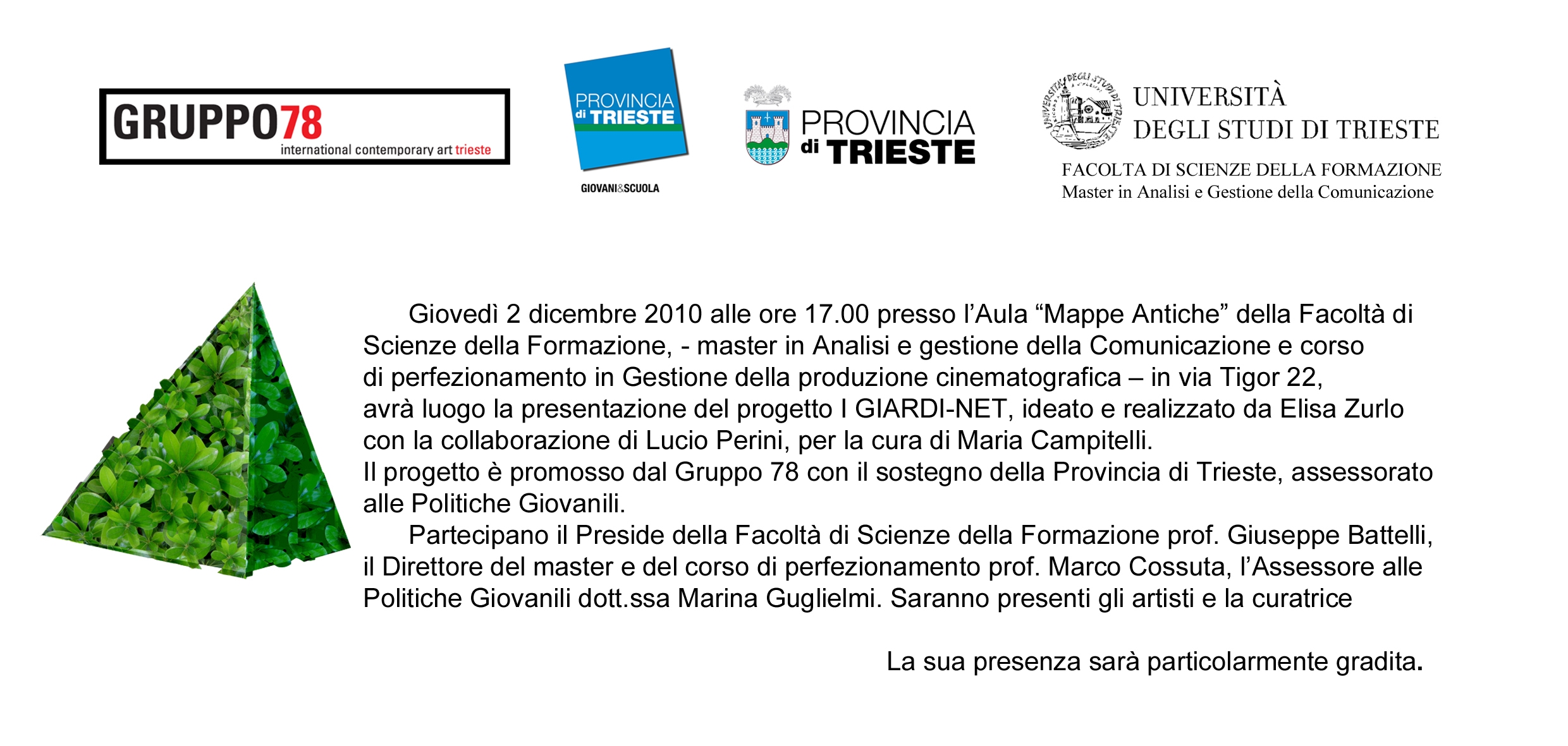 Nel corso dell’incontro di giovedì 2 dicembre, presieduto dal prof. Giuseppe Battelli, preside della facoltà di Scienze della Formazione, saranno presentati questi lavori con il coordinamento della curatrice del progetto Maria Campitelli e degli artisti Elisa Zurlo e Lucio Perini che lo hanno ideato e realizzato. Con l’auspicio che I’esperienza dei GIARDI-NET possa continuare a proliferare da verde a verde, negli spazi pubblici di luoghi aperti, con il gazebo coronato dal logo della Provincia e del Gruppo 78 e dalla piramide vegetale, simbolo della continuità del pensiero.