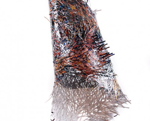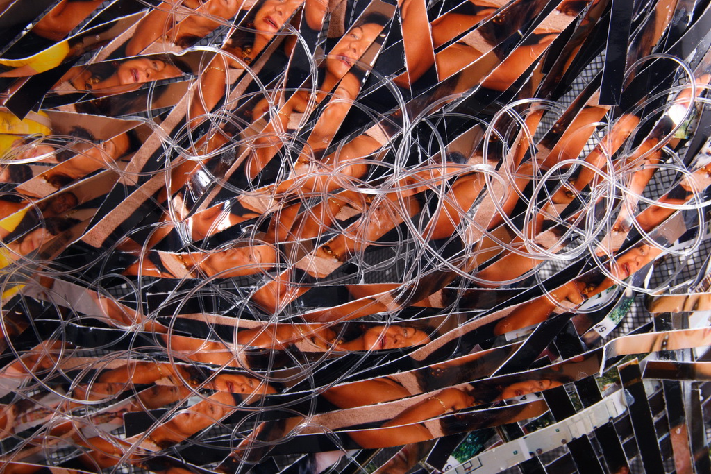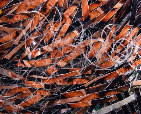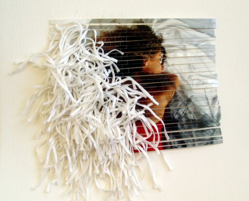 Giuliana Balbi è maestra dell’ibridazione. Elabora una "foto-tessitura" dove appunto si crea un tessuto con fotografie ritagliate in sottili striscioline composte in trama e ordito e coese con filo di nylon.