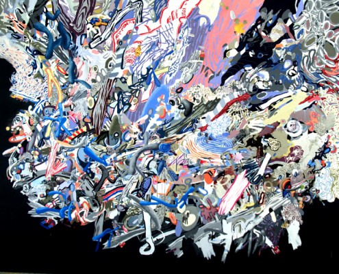 In questa mostra Paolo Ferluga espone alcune sue grandi tele, anzi smisurate, in cui converge un universo multiplo e complesso. La convergenza qui è insita al significato e alla funzione stessa della pittura. La dimensione dilatata è una componente determinante del suo lavoro, che sembra voler accogliere la pluralià infinita di cui è composta la vita, nonché la realtà circostante. Stili svariati, con il frequente uso del collage, e anche materiali diversi si connettono a creare un racconto senza inizio e senza fine. In un lavoro recentissimo compare anche il ritratto dell’artista nelle proporzioni 1 a 1.