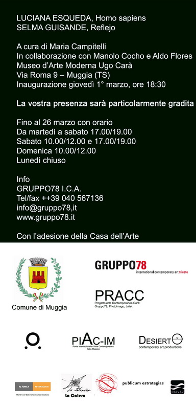 MUGGIA – Giovedì 1 marzo alle ore 18.30 inaugura la doppia personale delle artiste messicane Luciana Esqueda e Selma Guisande, rispettivamente coi progetti "Homo sapiens" e "Reflejo", presso il Museo d’Arte Moderna Ugo Carà di Muggia. La mostra, curata da Maria Campitelli, con la collaborazione di Manolo Cocho e Aldo Flores, è organizzata da GRUPPO78-International Contemporary Art e dall’Assessorato alla Cultura e alla Promozione della Città del Comune di Muggia, e va ad inserirsi nel fitto calendario 2012 delle esposizioni del progetto PRACC (Progetto Arte Contemporanea Museo Carà).