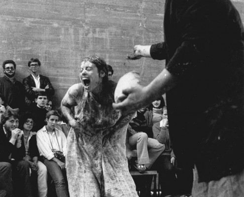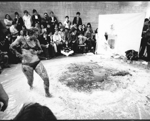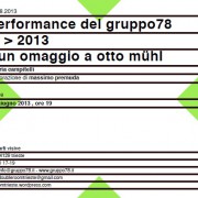 Nella rassegna ampio spazio verrà dato al primo omaggio dedicato al grande artista austriaco Otto Mühl, scomparso qualche settimana fa, e invitato nel 1978 a Trieste da ArteQuattro e Maria Campitelli per una serie di performance insieme ad Hermann Nitsch per presentare le azioni dell’Azionismo viennese in città. A tal proposito, Maria Campitelli ricorda che: “La performance è stata da sempre lo scheletro portante del GRUPPO78. L’associazione è nata infatti a seguito delle memorabili performance del Wiener Aktionismus prodotte nel 1978, prima all’Istituto d’Arte E. U. Nordio con Otto Mühl, e in seguito con l’Azione 62 di Hermann Nitsch al Teatro Romano di Trieste. Sono stati avvenimenti che hanno portato anche nella nostra città quel flusso innovativo e rivoluzionario che aleggiava nella ricerca artistica degli anni ’60-’70, dove la riscoperta e la rivisitazione del corpo occupava un posto centrale. Il binomio arte-vita, la necessità di uscire dagli schemi convenzionali dei linguaggi artistici e di sostituire i vocaboli della rappresentazione del reale con l’utilizzo diretto di materiali e della vita stessa (vedi l’Istituto dell’arte diretta di quegli anni a Vienna) appropriandosi così dello spazio con eventi che si snodano nel tempo, erano divenuti gli imperativi categorici di molti artisti in tutto il mondo. La pittura sembrava dunque appartenere ad un altro pianeta. La rievocazione di questo specifico aspetto dell’attività del GRUPPO78, in occasione dei suoi 35 anni, ci porta a ricordare in particolar modo la presenza di Otto Mühl all’Istituto d’Arte, nel ’78 appunto, come una premessa ineludibile, rispetto a quello che sarebbe poi stato il GRUPPO78, anche per il fatto che, proprio in questi giorni, l’artista, ormai avanti negli anni, è venuto a mancare in Portogallo, ultima sua dimora esistenziale. Mühl aveva presentato a Trieste, in una sede del tutto out, quale una scuola d’arte, e non in un’accademia, rivolgendosi quindi ad un pubblico giovanissimo, uno straordinario evento dimostrativo del lavoro che svolgeva, preceduto dalla fase preparatoria e liberatoria delle Selbsdarstellungen. Cioè le autopresentazioni che hanno coinvolto tutti gli studenti, trascinati in divertenti dinamiche ludiche e anticonvenzionali. L’azione indimenticabile partiva dalla pittura su di una carta stesa su un cavalletto, da cui ad un certo punto fuorusciva, gradualmente, il corpo reale di una performer, sostituendosi in carne e ossa all’immagine tracciata sulla superficie cartacea. La realtà viva che ribalta la convenzione. E lo scatenamento poi di una danza orgiastica a diretto contatto con i materiali più disparati, dalla salsa di pomodoro alle piume.”