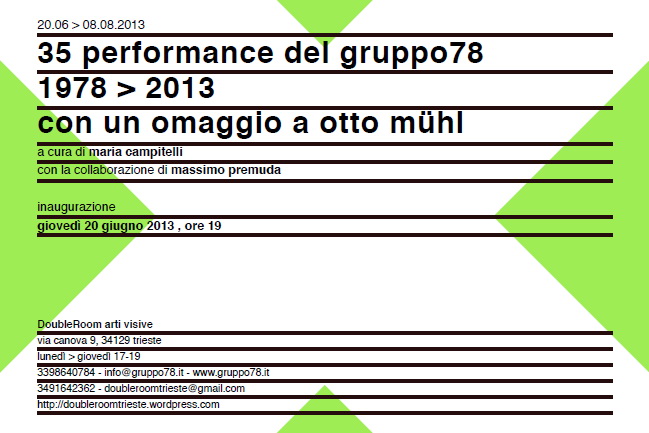 L’esposizione, organizzata dal GRUPPO78 e curata da Maria Campitelli in collaborazione con Massimo Premuda, rappresenta dunque un’occasione eccezionale per festeggiare il trentacinquesimo anniversario di quest’associazione che negli anni ha invitato a Trieste i protagonisti della scena artistica internazionale contribuendo in maniera significativa alla storia culturale della città. La mostra presenta la densa storia del GRUPPO78 attraverso materiale d’archivio sulle performance e gli happening prodotti, e attraverso documentazione visiva, foto, video e progetti, divisi in sezioni tematiche cronologiche, dai suoi esordi con le memorabili performance di Hermann Nitsch al Teatro Romano organizzata con ArteQuattro, da cui nascono le premesse della costituzione del Gruppo78, e di Otto Mühl all’Istituto d’Arte Nordio degli anni ’70, fino allo straordinario spettacolo multimediale di danza verticale realizzato sul pontone Ursus di qualche anno fa e la performance dell’artista sudafricana Mamela Nyamza al Museo Ferroviario della scorsa estate in collaborazione con KineoFilm.