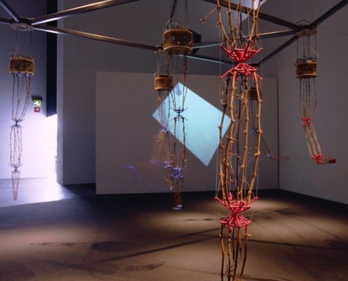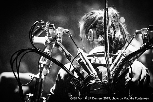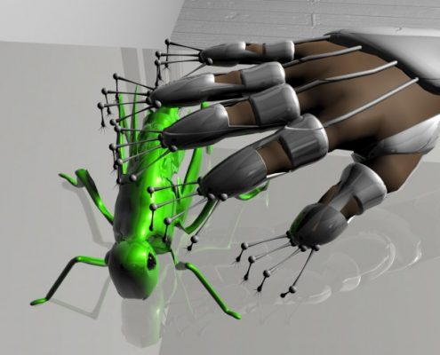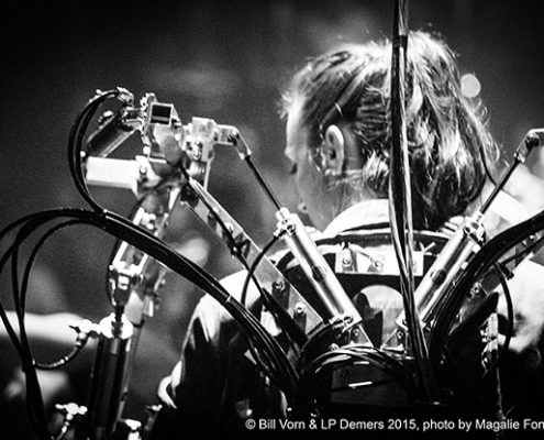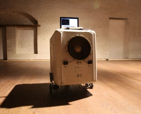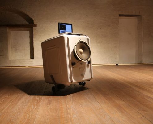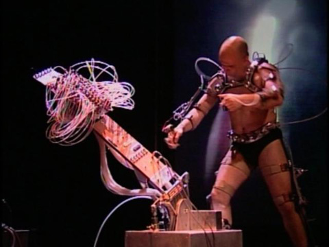 Accompagna l’esposizione delle opere robotiche una serie di video che attestano alcune celebri performances di protagonisti internazionali di questo straordinario settore creativo. Di Marcel Lì Antunez Roca, lo spagnolo che come Stelarc ha lavorato soprattutto sulle possibili trasmutazioni del corpo umano, ci sarà “Afasia” storica performance meccatronica del 1998, pluripremiata, rielaborata negli anni successivi, in cui l’artista è il protagonista assoluto realizzando con l’exoskeleton (robot) indossato, tutti gli effetti teatrali sono-visivi e motori. E alcuni video che si riallacciano alla biorobotica, o biotech art recente corrente di ricerca che tende a fondere biologia con tecnologia, come il video che propone il primo insetto cyborg della storia (uno scarafaggio) dello statunitense Garnet Hertz, Autopoiesis e Abiopoiesis Microbiome di Ken Rinaldo, affascinato dalle culture batteriche che condizionano il tempo, il gatto robotico che desidera catturare un pesce elettronico di France Cadet ed infine lo straordinario spettacolo “Inferno” del canadese Bill Vorn che rivisita l’atmosfera dell’inferno dantesco con 25 performer dotati di exoskeleton che generano i movimenti dei performer, in una danza infernale.