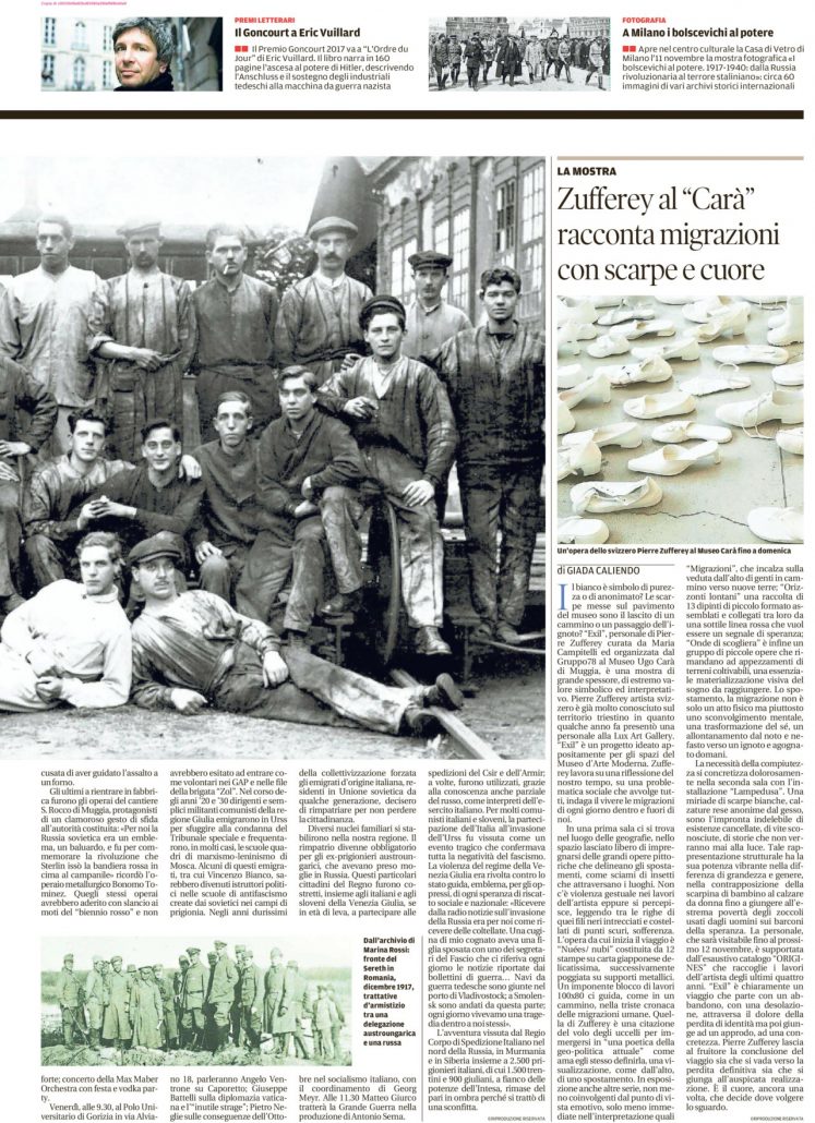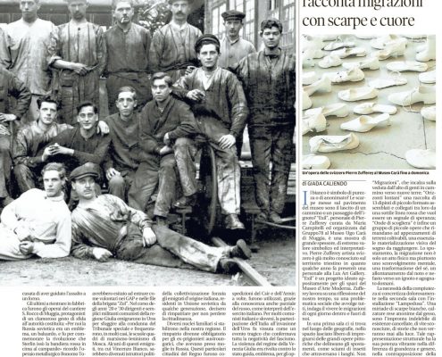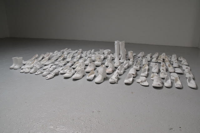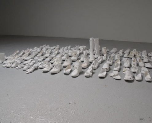 “Lampedusa” invece è una grande installazione con tante scarpe posate al suolo, tutte uniformate e quindi rese anonime dal gesso bianco che le ricopre, con qualche eco delle antiche esistenze cancellate.