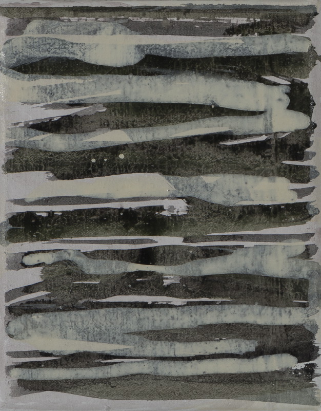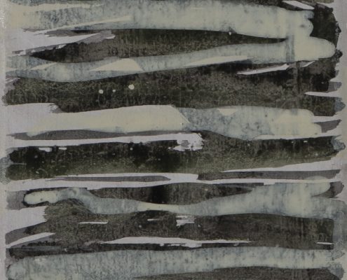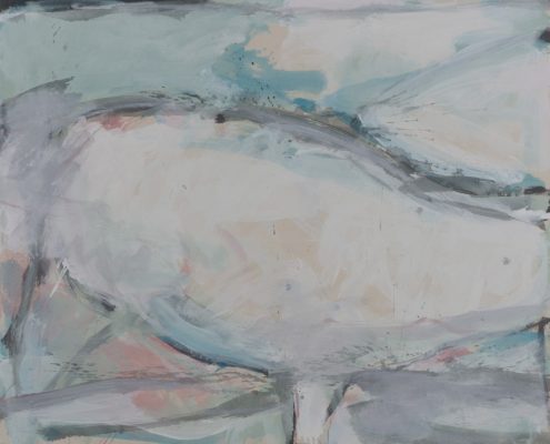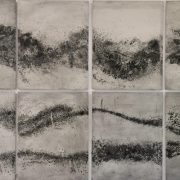 C’è poi una grande pittura, “Migrations/Migrazioni” che insiste ancora sulla veduta dall’alto, di un popolo in cammino verso nuove terre, resa con delicatissime velature cromatiche, dove l’evocazione dell’acqua è sempre presente.