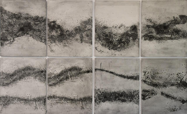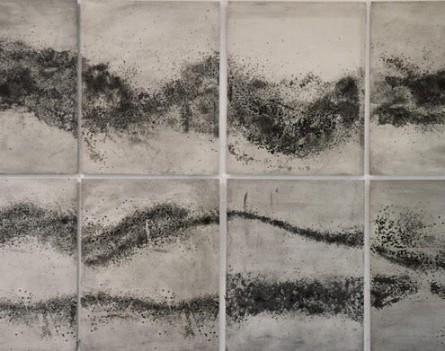 La mostra consta di diverse parti. E’ dominata d un’opera “guida” “Nuées/nembi” costituita da 10 stampe su delicata carta cinese di cm 100 x 80 ciascuna, un blocco imponente che rappresenta insieme il mobile flusso nel cielo degli uccelli migratori e quello in terra di migranti umani, piccoli punti in movimento, un popolo che fugge, visto dall’alto.“Una poetica della geo-politica attuale” la definisce l’artista.