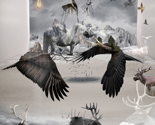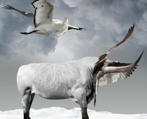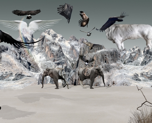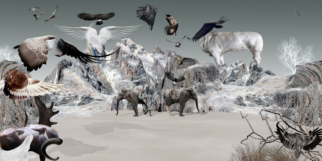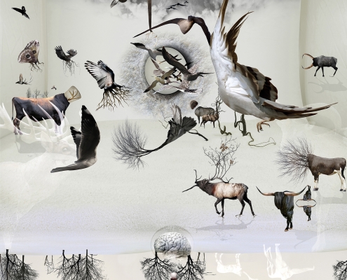 Dando libero sfogo all’immaginazione, alla chimera, all’inverosimile, costruisce un bestiario paradossale che si sottrae alle leggi della gravità, che compare a testa in giù, e pure gli alberi crescono alla rovescia, ambientato in paesaggi a loro volta alterati, resi asettici, lunari, e si propone in diverse modalità. Ossia in grandi composizioni dal titolo allusivo e significativo come “Olimpo”, zoomorfo evidentemente, che raduna animali disparati, per lo più africani, in cui – dice l’autore – “sembra di assistere alle prodigiose metamorfosi grazie a cui Zeus consumava i sui mitologici amplessi”, oppure animali singoli, o accorpati in trittici, o ancora le sequenze di “dialoghi” dove due diverse mitiche creature s’incontrano in un perfetto equilibrio compositivo. C’è anche la sequenza degli insetti, stampati su tela, dalle ramificazioni arboree, costituendo un sorprendente ibrido vegeto- animale. Sembrano evocare l’ibridismo bio-tecnologico oggi in atto, a livello di ricerca e di applicazioni tecno-scientifiche.