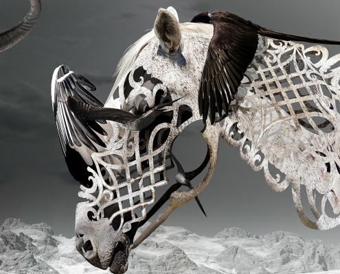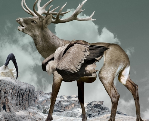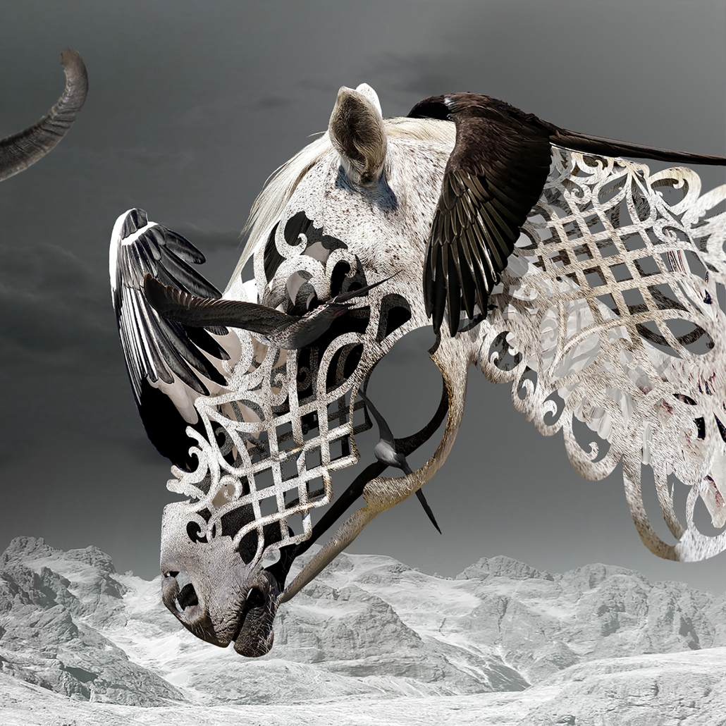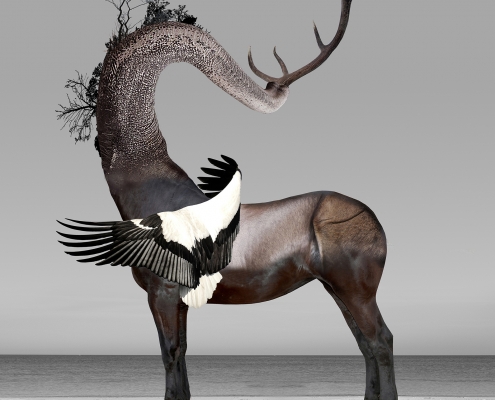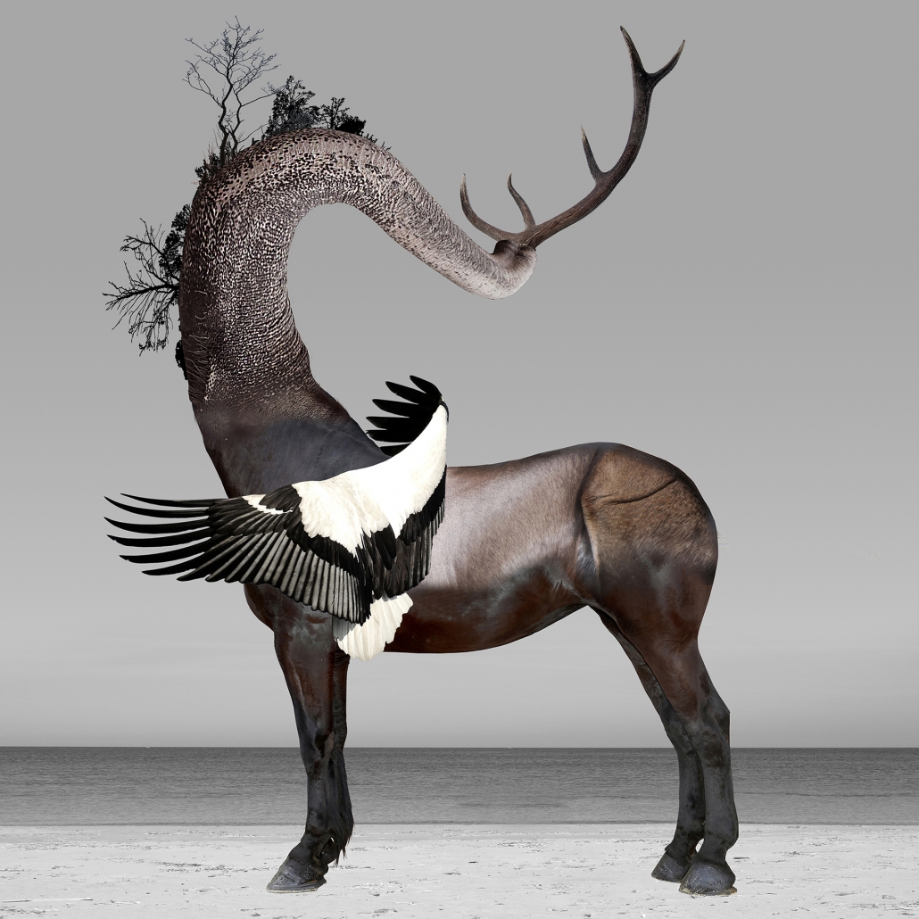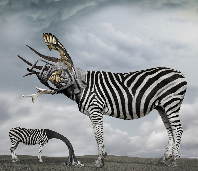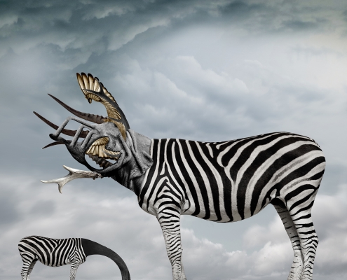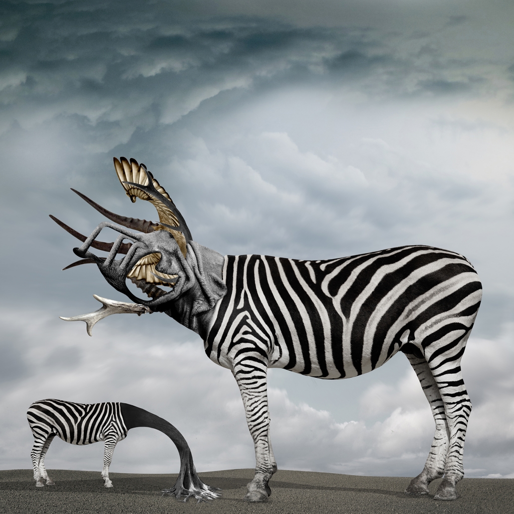 Questo ciclo di opere di GIORDANO RIZZARDI che formano la “Zoologia Fantastica” è caratterizzato da due aspetti salienti: l’alterazione, la scomposizione e ricomposizione arbitraria del reale così come lo conosciamo – relativamente agli animali proposti – sfociando in un surrealismo visionario, e la specifica realizzazione tecnica, lucida, impeccabile, graficamente raffinatissima, grazie all’applicazione delle tecnologie digitali e alla controllata composizione dei fotomontaggi.
