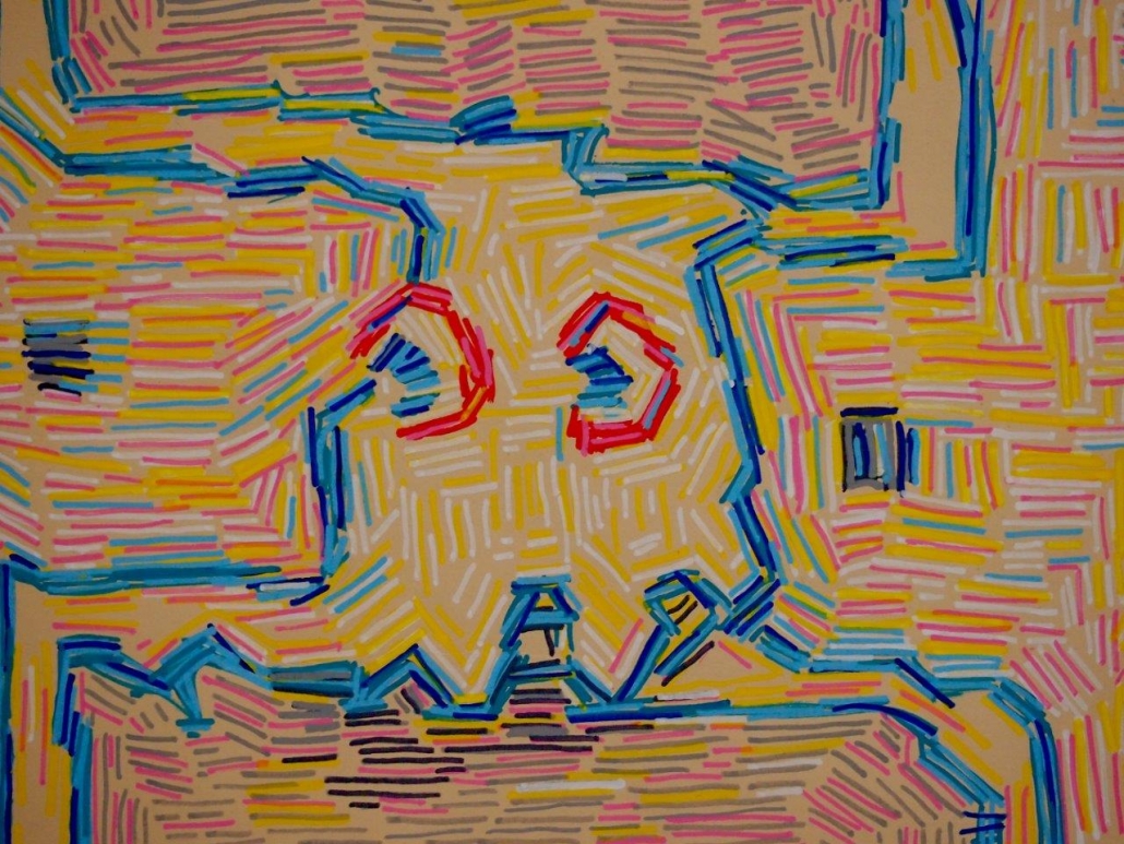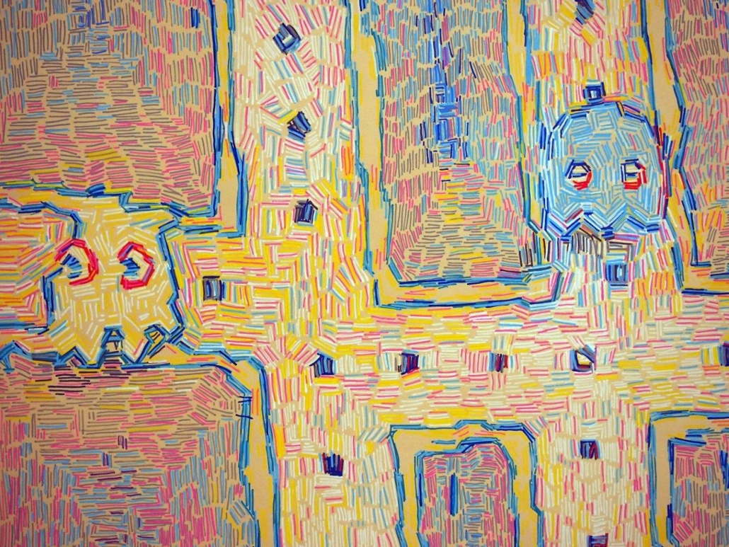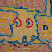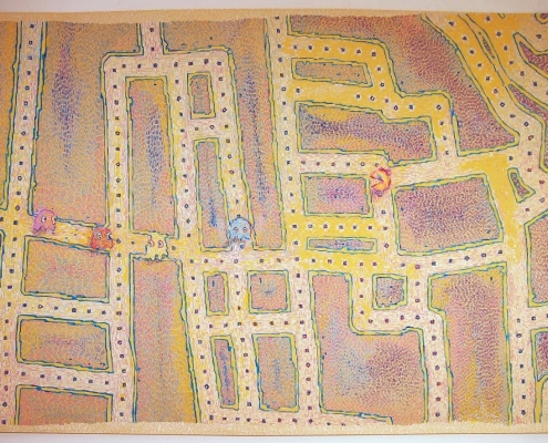 Nella ricerca costante su questo percorso intrapreso dall’artista, si aggiungono di continuo nuove appendici, nuovi ruoli, in cui l’artista si immedesima, come quello dell’Editore, con il copyright, o quello dell’architetto per la necessità, in entrambi i casi, di convalidare, di autenticare il proprio progetto, il lavoro prodotto, apponendovi un marchio. Nasce così il timbro “Olga Danelone – International Street View”, qui esposto assieme alle opere timbrate. Oppure, ultimo corollario di percorso, “Pac-Man, in transito” questa creaturina tutto testa e grandi occhi, assimilabile ai giochi elettronici reperibili anche nei casinò e quindi foriera di speranze e desideri, come di percorsi-destino precostituiti, che s’aggira per le vie del mondo, e in cui si cala, nell’era tecnologica, la nostra dimensione umana.