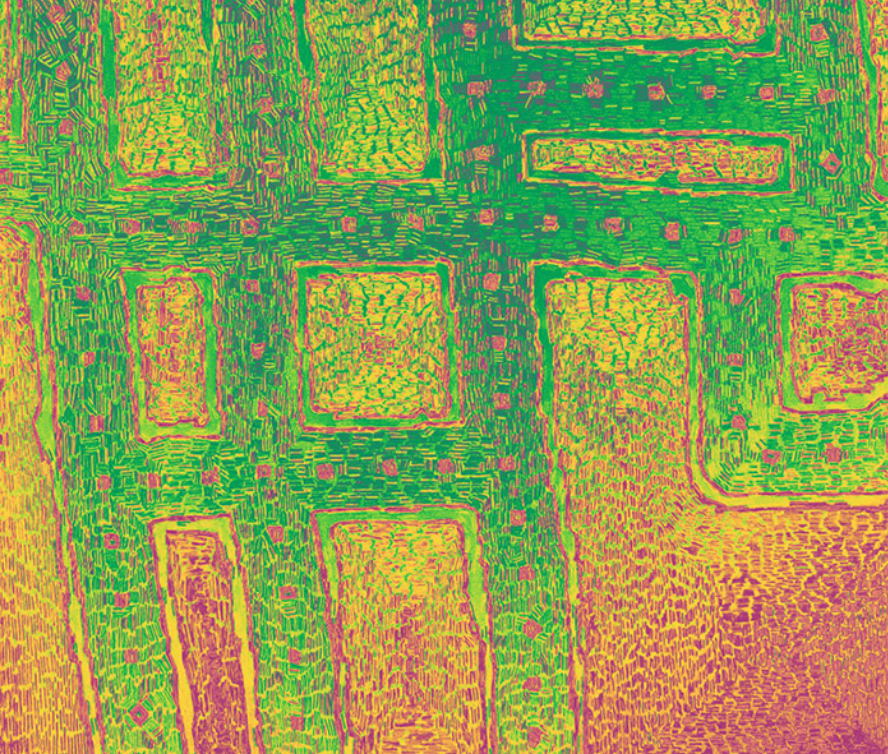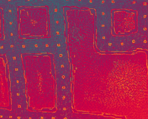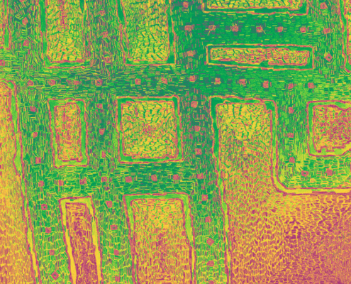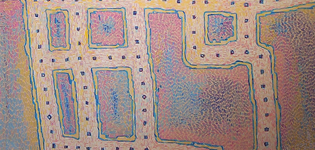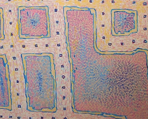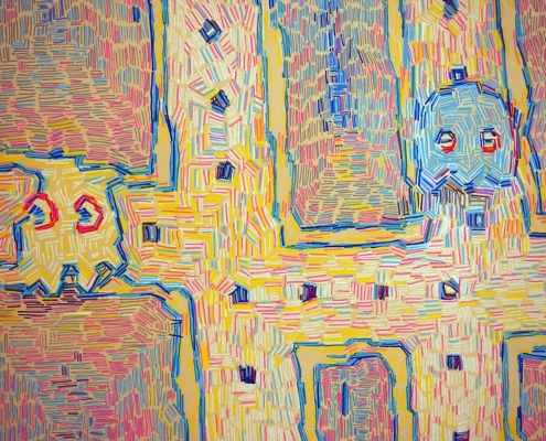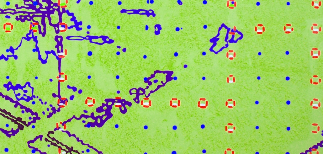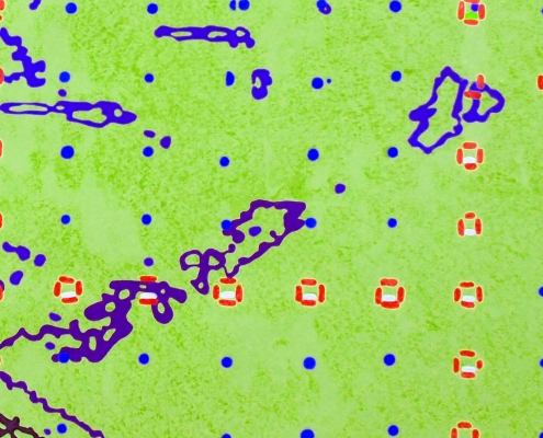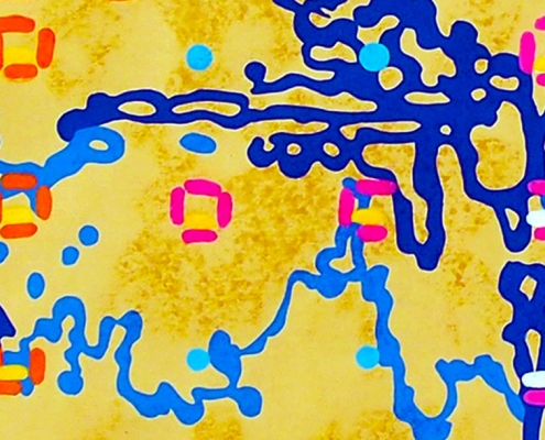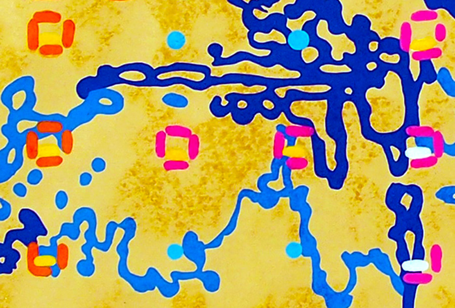 Ci sono alcuni elementi basilari nella ricerca pittorica di Olga Danelone: la comunicazione, intesa come linguaggio chimico, il senso della comunità esteso allo sviluppo esponenziale dell’umanità sul pianeta (oggi oltre 7.000.000.000), l’analisi dello status delle comunità degli insetti, in particolare delle formiche, che comporta movimenti apparentemente inspiegabili, ma che si ricollegano al processo della trofallassi, allo scambio reciproco cioè del nutrimento (base della componente bio-chimica della comunicazione), che comporta la dinamica sociale; l’impulso motorio “moltiplicato nel tempo della totalità dell’universo”, l’dea del transito che sottende il concetto fondante della vita, la necessità di trasferire questa congerie di dati, frutto di studi scientifici e filosofici (“L’albero della conoscenza” di Varela e Maturana è un punto di partenza della concezione biologica dell’aggregato umano) in una visualizzazione territoriale, intesa come espressione di una condizione urbana contemporanea. Questa produce le ”mappe”, inconfondibile elaborazione visiva di Olga Danelone. E con le mappe i simboli, assolutamente contemporanei, di un’idea di “transito” inarrestabile, quali le autostrade, gli svincoli, le rotatorie e le confluenze, le scale mobili, – parallelo umano della trofallassi degli insetti – che produce comunanza di intenti e desideri, l’intesa di gruppo, la coesione sociale.
