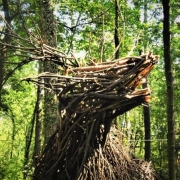 Quindi accanto ai già esistenti animali fantastici di Simone Paulin e di Devid Strussiat – la lumaca gigantesca composta di blocchi di legno, l’aquila aerea di rami intrecciati – ma anche presenze umane come il guerriero in marcia sopra la ruota di pietre o la “famiglia” i cui membri fatti di tortuosi rami e radici , si accampano nei sentieri del bosco, accanto anche ai segnali più astratti e concettuali come la spirale di pietre di Manolo Cocho “simbolo di vento, movimento, potere invisibile… rappresentante la geometria frattale”, o con diverso intento, le pietre traforate aleggianti nell’aria tra loro dialoganti di Maja Pogacnik o ancora i segnali geometrici minimali in pietra, traduzione contemporanea dei megaliti preistorici usati in meteorologia e aviazione di Laura Malacart, il “collettore di senso” in ceramica, quindi in terra cotta, di Majda Gregoric, accanto a queste opere cha hanno animato il bosco dal 2018, si allineano, ciascuno nel suo habitat prescelto, i nuovi lavori.
