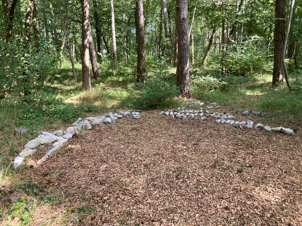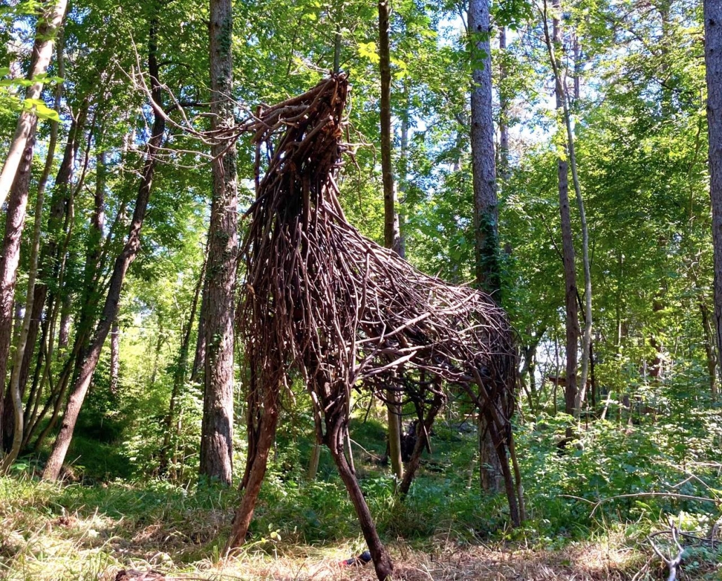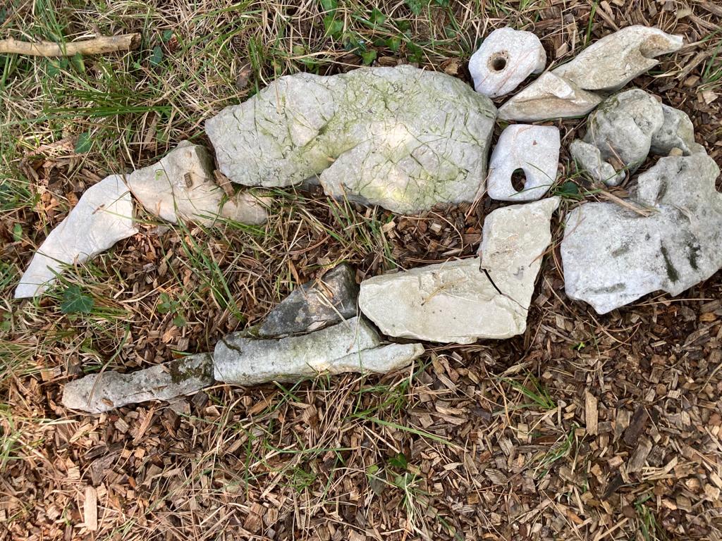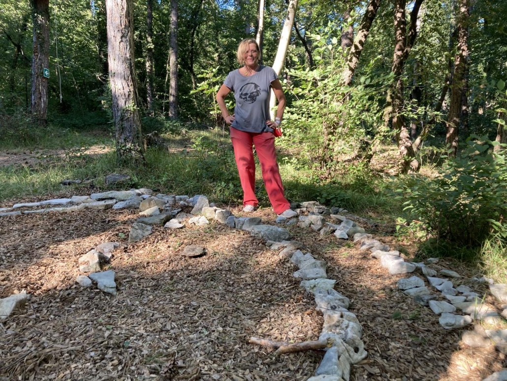 Quindi accanto ai già esistenti animali fantastici di Simone Paulin e di Devid Strussiat – la lumaca gigantesca composta di blocchi di legno, l’aquila aerea di rami intrecciati – ma anche presenze umane come il guerriero in marcia sopra la ruota di pietre o la “famiglia” i cui membri fatti di tortuosi rami e radici , si accampano nei sentieri del bosco, accanto anche ai segnali più astratti e concettuali come la spirale di pietre di Manolo Cocho “simbolo di vento, movimento, potere invisibile… rappresentante la geometria frattale”, o con diverso intento, le pietre traforate aleggianti nell’aria tra loro dialoganti di Maja Pogacnik o ancora i segnali geometrici minimali in pietra, traduzione contemporanea dei megaliti preistorici usati in meteorologia e aviazione di Laura Malacart, il “collettore di senso” in ceramica, quindi in terra cotta, di Majda Gregoric, accanto a queste opere cha hanno animato il bosco dal 2018, si allineano, ciascuno nel suo habitat prescelto, i nuovi lavori.