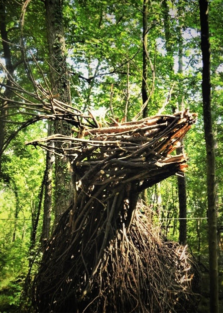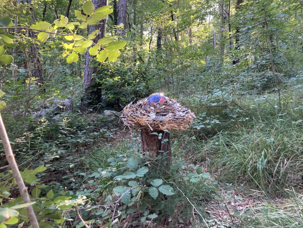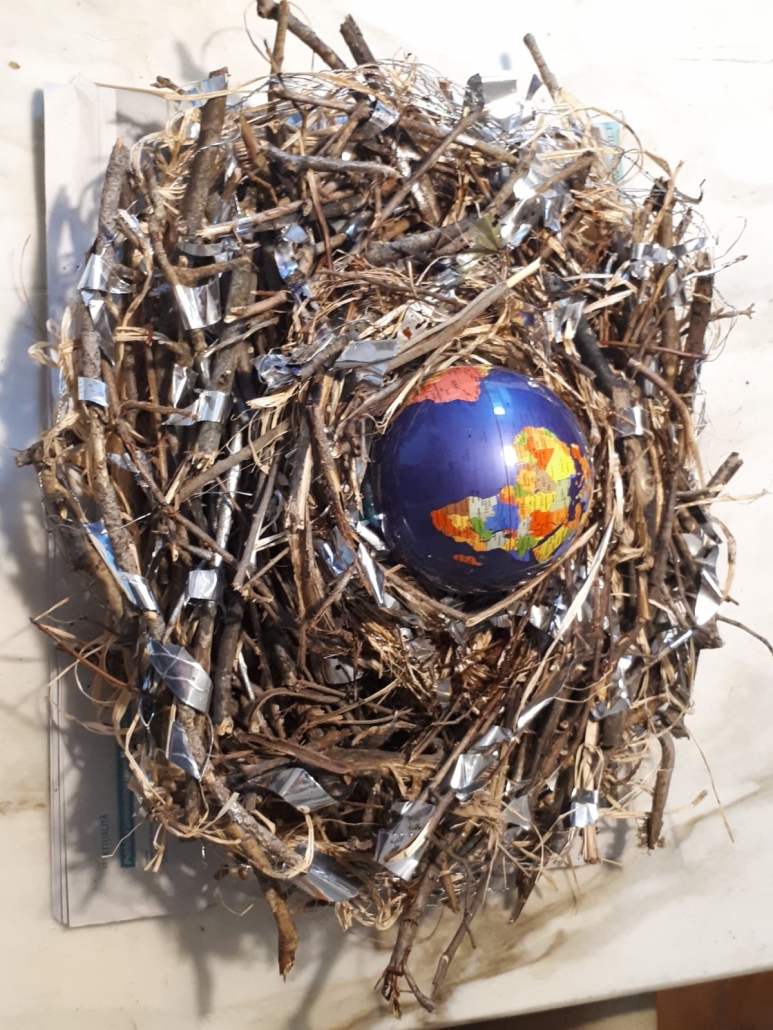 Il nido fatto d’intrecci di rami, di norma collocato in un luogo idoneo tra i rami degli alberi, qui simbolicamente viene disposto sopra un tronco conficcato nel terreno. Un albero simbolico per reggere un nido che, altrettanto simbolicamente, accoglie la sfera del pianeta terra.