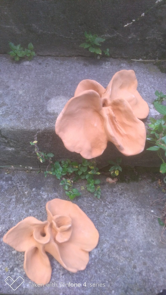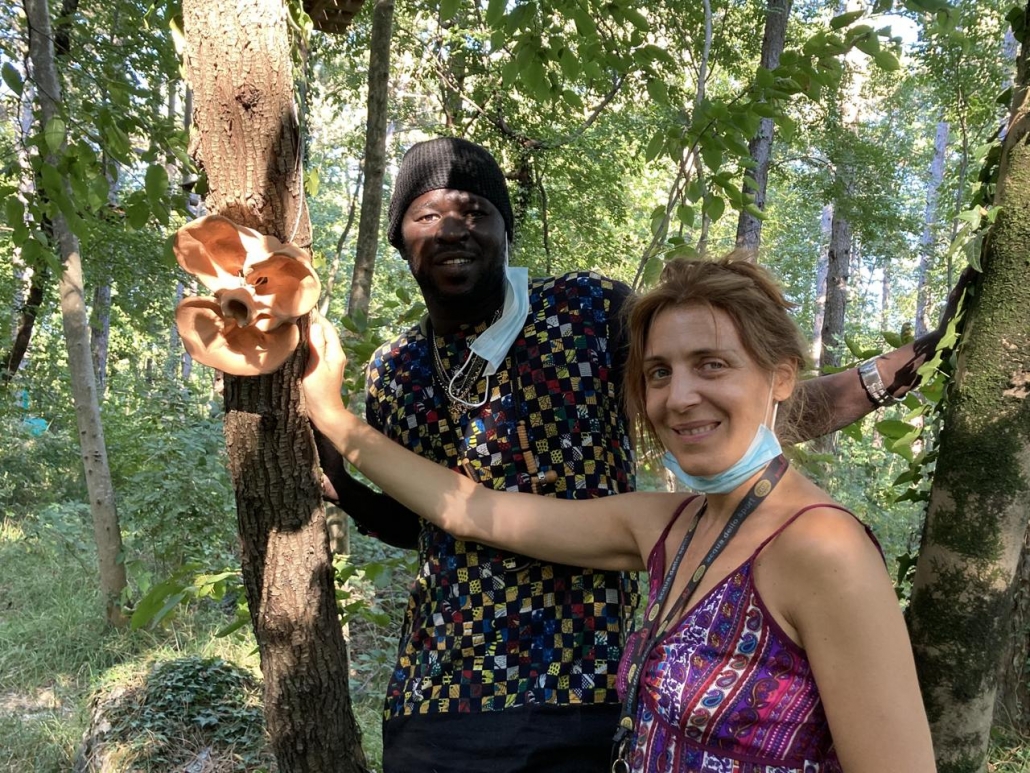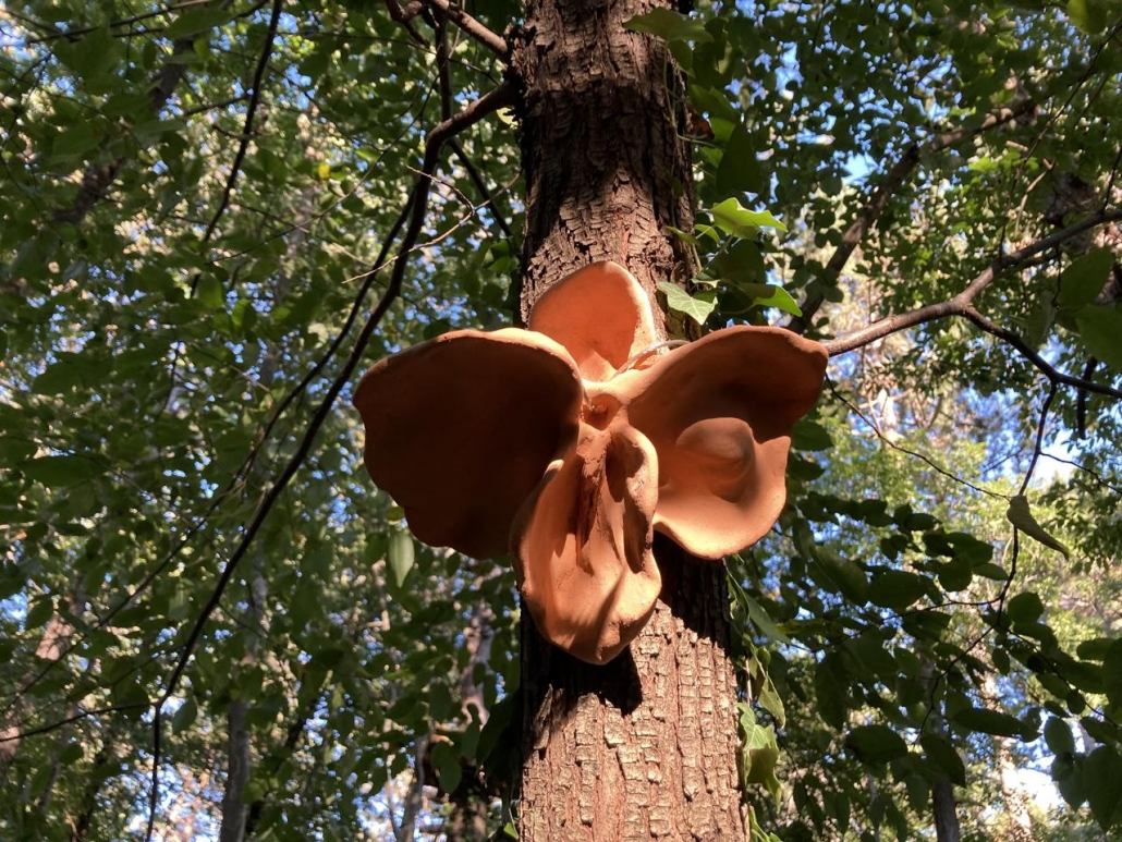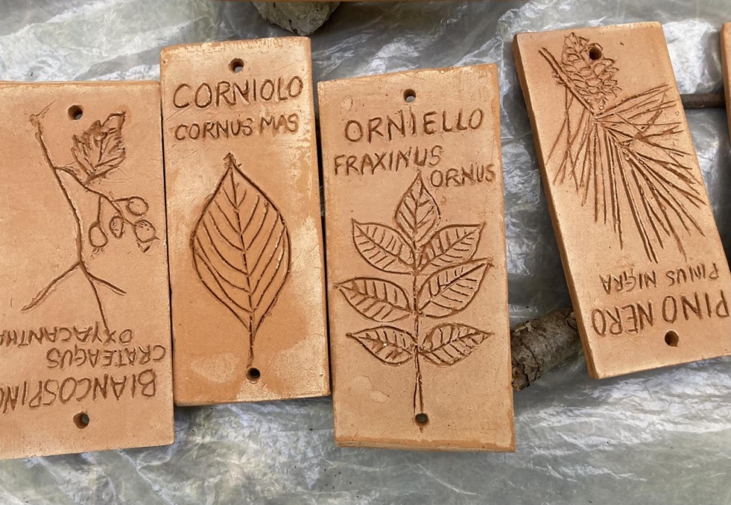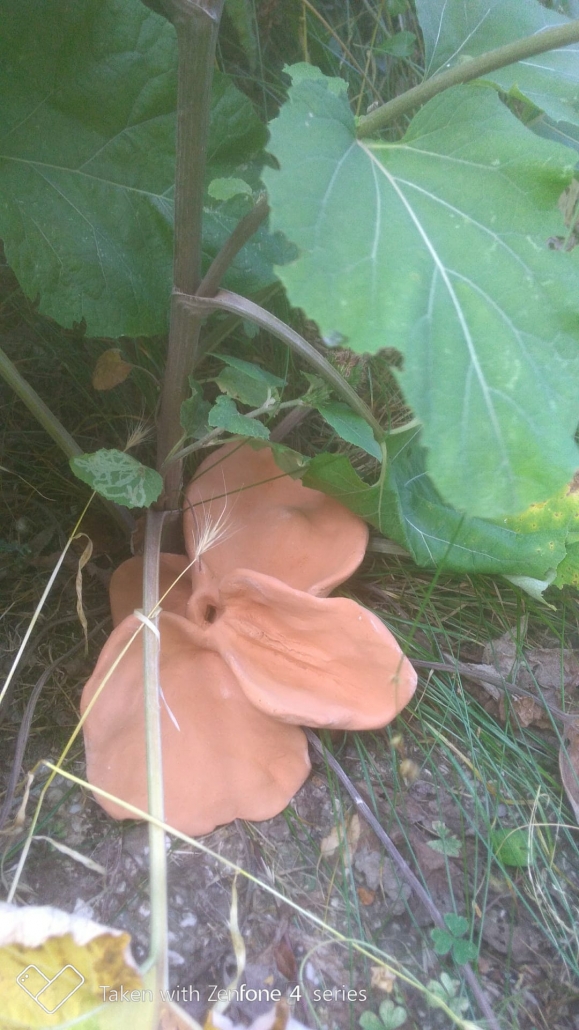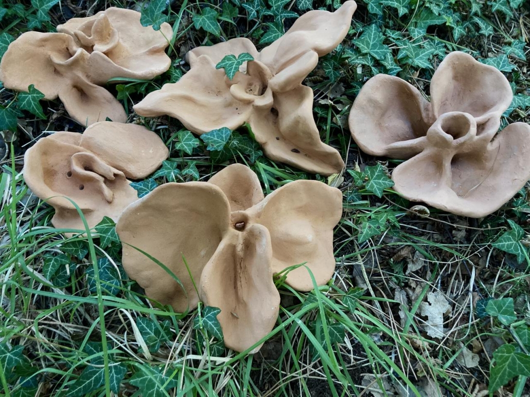 Paola Pisani è un’artista multimediale e transdisciplinare che da sempre si interessa al rapporto natura-cultura, in particolare alla simbologia del fiore. Nel bosco di Ceroglie porta un bouquet di fiori di argilla e delle mattonelle botaniche, ispirandosi ai motivi floreali presenti nell’architettura austroungarica. Dedica il lavoro a Beaudelaire, poeta dei “Fiori del male” a due secoli della sua nascita (1821). Dice l’artista ,” nella foresta cattedrale di simboli, tempio di misteriosi e confusi messaggi, fiori di terra galleggiano, spalancando i loro petali deformi eppure sensuali”. Ai fiori si accompagnano le mattonelle, sparse lungo i sentieri, concepite come un’estensione dell’intervento operato nel 2019 all’Abbazia di Noirlac in Francia. Elabora in questo modo antichi percorsi celtici e romani, fornendo nel contempo indicazioni visive e descrittive sulla vegetazione locale.