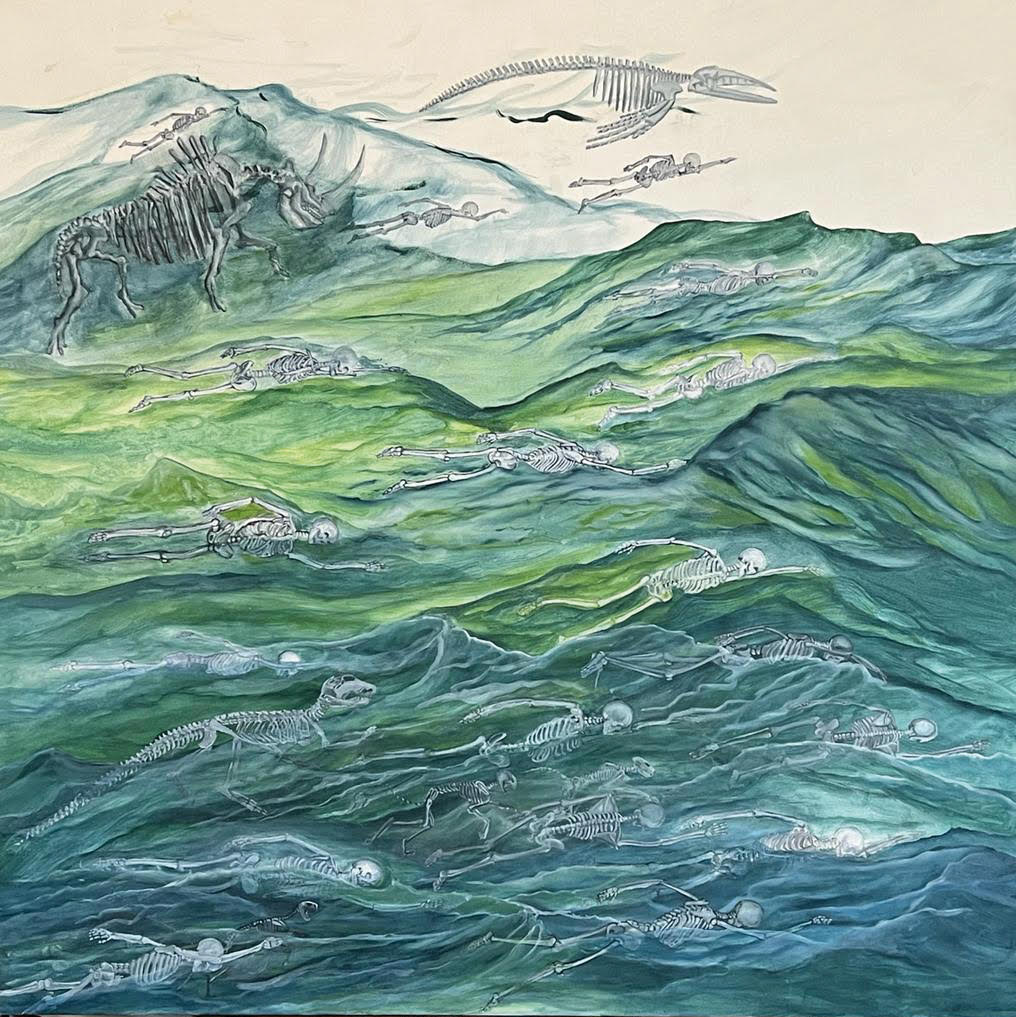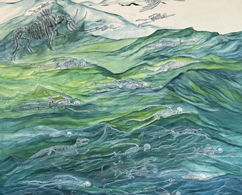La seconda mostra, aQua, nasce e si sviluppa soprattutto a Trieste, pur prevedendo presenze da altri luoghi, anche stranieri, con la curatela di Maria Campitelli, storica fondatrice del Gruppo78 International Contemporary Art. Raccoglie installazioni e tutte le declinazioni e contaminazioni perseguite dall’attuale ricerca espressiva. E’ dedicata al tesoro liquido più prezioso per la vita, di cui da un lato gli artisti rilevano la limpida bellezza, l’insostituibile funzione vitale e la sua essenza di bene collettivo, dall’altro la sua degenerazione causata dai cambiamenti climatici – che provocano siccità, innalzamento del livello dei mari, scioglimento dei ghiacciai – e dall’inquinamento, entrambe conseguenze dirette delle attività umane. L’uomo, che per secoli si è sentito padrone al centro del mondo, oggi è chiamato a un’analisi differente del suo ruolo nel mondo. “Si parla oggi di declino dell’antropocentrico, di conclusione del ciclo “Homo sapiens” – commenta Maria Campitelli -. James Lovelock, scienziato inglese, già nel 1979 in “Gaia. A new Look at Life on Earth” aveva avvertito che l’uomo, facendo parte del sistema sinergico autoregolante che mantiene e perpetua le condizioni per la vita sul pianeta come tutti gli esseri viventi non gode dei diritti privilegiati che si è auto-attribuito (a partire dall’umanesimo rinascimentale), ponendosi al centro del mondo. E’ un partner assieme agli altri organismi, che contribuisce a mantenere l’equilibrio della vita sulla Terra, ma può anche distruggerlo”. In Marmorto, olio su tela e video (in collaborazione con Simone Di Mauro) di Cecilia Donaggio Luzzato Fegiz, vediamo degli scheletri palestrati sfoggiare un olimpionico “front crawl”, mentre all’orizzonte futuri fossili lambiscono i cavalloni. Black cube, di Cristina Lombardo, è una meditazione sull’innalzamento delle acque, con un riferimento storico al Diluvio Universale attualizzato con l’ambientazione in Piazza Unità, a Trieste. L’arca diventa allora una nave da crociera, che potrebbe salvare gli “onesti” dall’impetuosità dei marosi. E all’interno dell’installazione s’inserisce un modellino della basilica di San Pietro in argilla cruda, che si consumerà durante il tempo della mostra: una meditazione sulla temporaneità di tutti i poteri paragonati alla potenza della natura. Con l’installazione I’m Alien Fabiola Faidiga realizza una vistosa scatola nera, approdata su un lontano pianeta, residuo dell’esplosione della terra, da cui si possono cogliere le ultime parole registrate di un’inascoltata esortazione: “Please open your hears and then act” (Vi prego, aprite i vostri cuori e agite), pronunciate da un’attivista keniota dell’ambiente e del clima. Alla scatola si può accedere solo dichiarandosi “Alieni, più intelligenti degli umani”. Simone di Mauro, in In the blink of an eye, utilizza un sistema di riconoscimento facciale che rileva lo stato degli occhi dell’utente, accelerando il processo di avanzata del tempo ogni volta che gli occhi sono chiusi o si battono le palpebre: l’idea è quella di non distogliere lo sguardo davanti alla trasformazione, seppure lenta, del nostro pianeta e dei suoi componenti, come l’acqua, la vegetazione e l’atmosfera.