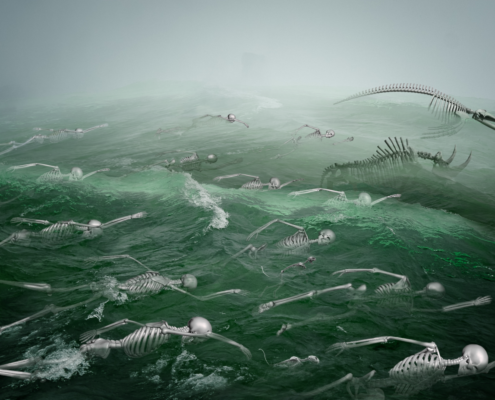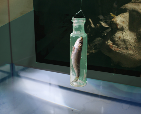 In AQua, gli artisti rilevano da una parte la sua naturale limpida bellezza, la sua insostituibile funzione vitale, bene collettivo che va garantito e tutelato alle comunità, o, da un’altra, parte, la sua degenerazione nell’inquinamento o ancora evidenziano con installazioni metaforiche, particolari fenomeni che caratterizzano il mutamento climatico come l’innalzamento dell’acqua del mare per effetto dell’aumento della temperatura del pianeta. Azioni performative e percorsi transdisciplinari che incrociano la ricerca scientifica, coadiuvati dalle nuove tecnologie, attestano la pluralità, la ricchezza e la complessità delle risposte artistiche in un universo espanso e interconnesso.