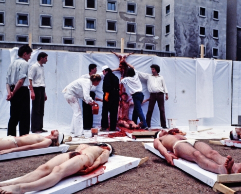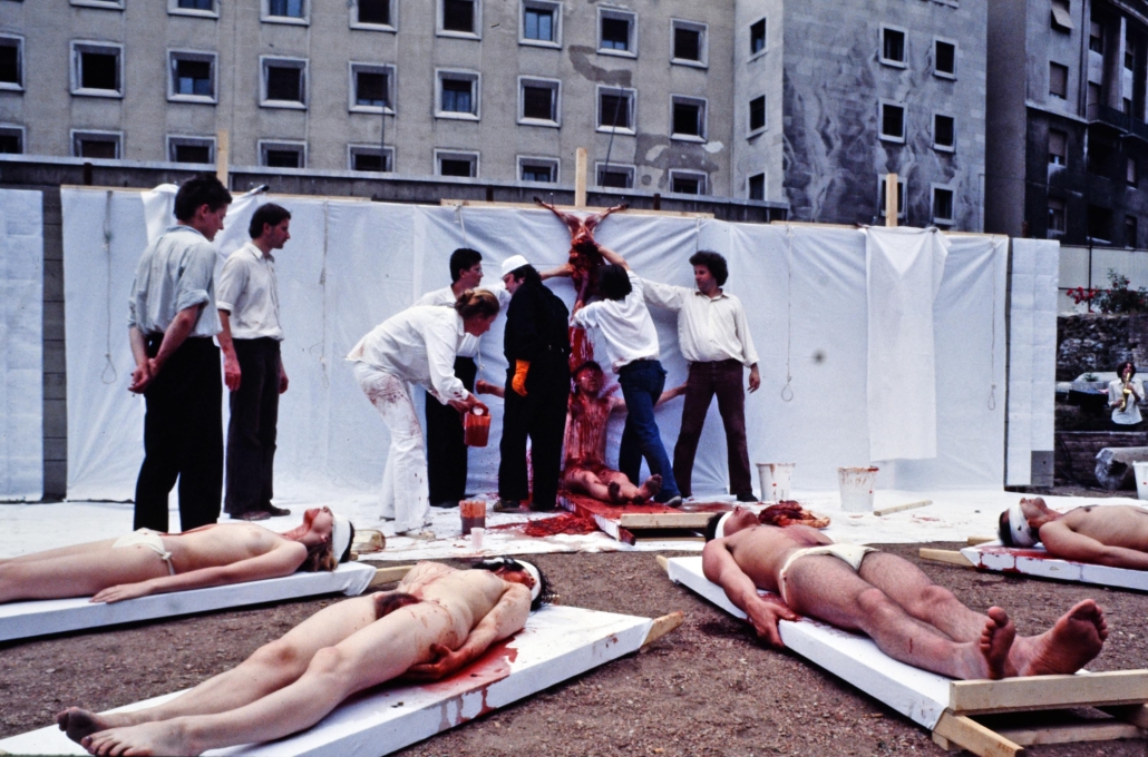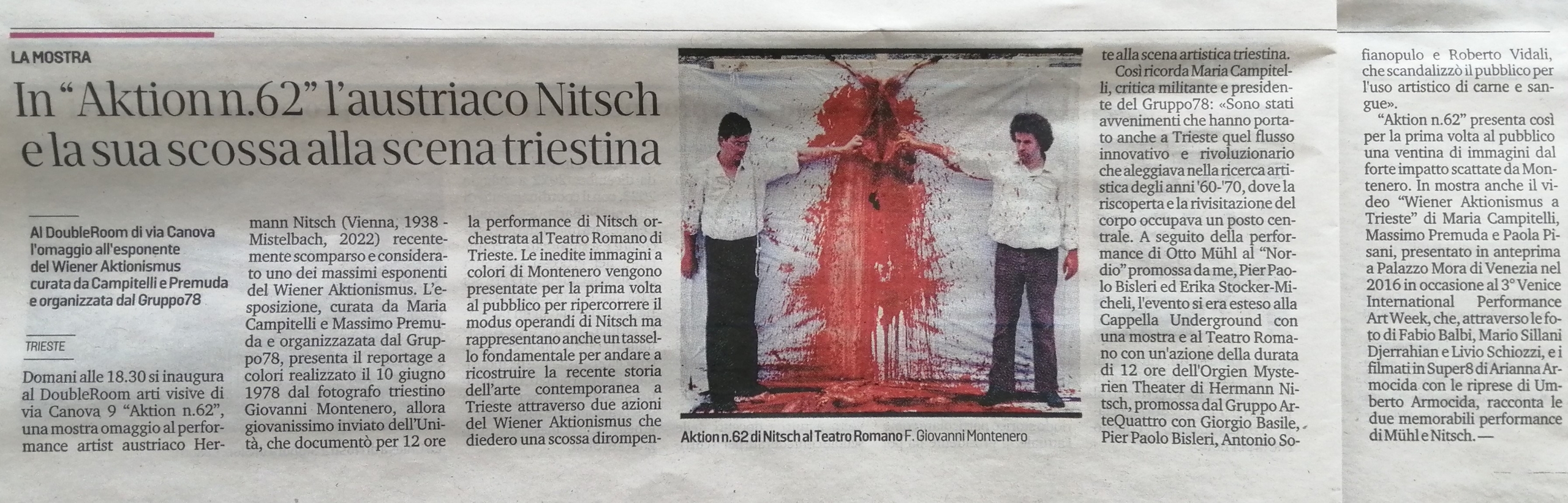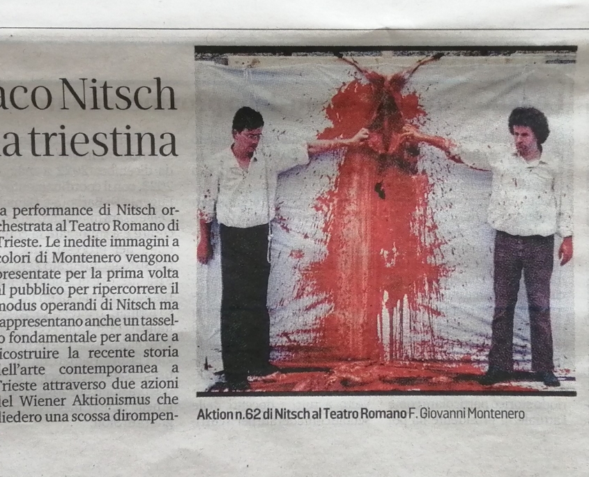 Così Maria Campitelli, critica militante e presidente del Gruppo78, ricorda l’importanza di queste due azioni realizzate a Trieste nel 1978 anche in relazione alla nascita dell’associazione stessa: “La performance è stata da sempre lo scheletro portante del Gruppo78. L’associazione è nata infatti a seguito delle memorabili performance del Wiener Aktionismus prodotte nel 1978, prima all’Istituto d’Arte “Nordio” con Otto Mühl, e in seguito con l’Azione 62 di Hermann Nitsch al Teatro Romano di Trieste. Sono stati avvenimenti che hanno portato anche a Trieste quel flusso innovativo e rivoluzionario che aleggiava nella ricerca artistica degli anni ’60-’70, dove la riscoperta e la rivisitazione del corpo occupava un posto centrale. Il binomio arte-vita, la necessità di uscire dagli schemi convenzionali dei linguaggi artistici e di sostituire i vocaboli della rappresentazione del reale con l’utilizzo diretto di materiali e della vita stessa, erano divenuti gli imperativi categorici di molti artisti in tutto il mondo, appropriandosi così dello spazio con eventi che si snodano nel tempo. La pittura sembrava dunque appartenere ad un altro pianeta. A seguito della performance di Otto Mühl all’Istituto d’Arte “Nordio” promossa dalla sottoscritta, Pier Paolo Bisleri ed Erika Stocker-Micheli, l’evento si era esteso alla Cappella Underground con una mostra e al Teatro Romano con un’azione della durata di 12 ore dell’Orgien Mysterien Theater di Hermann Nitsch, promossa dal Gruppo ArteQuattro con Giorgio Basile, Pier Paolo Bisleri, Antonio Sofianopulo e Roberto Vidali, che scandalizzò il pubblico per l’uso artistico di carne e sangue.”