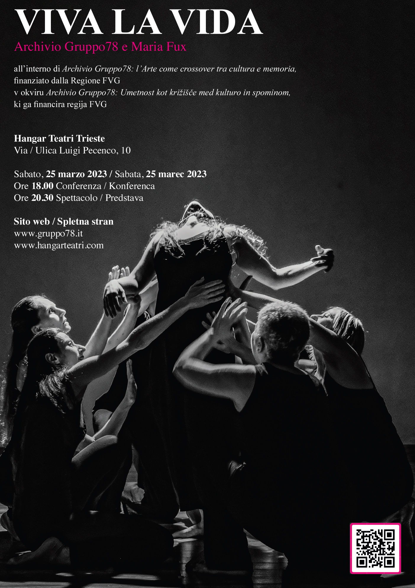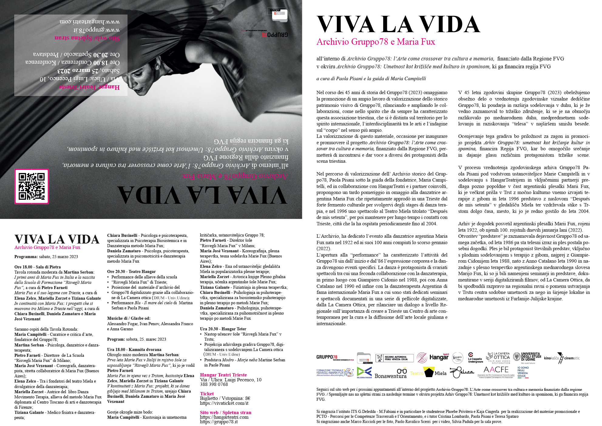 La valorizzazione di questo materiale, occasione per inaugurare e promuovere il progetto Archivio Gruppo78: l’Arte come crossover tra cultura e memoria, finanziato dalla Regione FVG, permetterà di incontrarsi e dar voce a diversi dei protagonisti della scena triestina. Nel percorso di valorizzazione dell’ Archivio storico del Gruppo78, Paola Pisani sotto la guida della fondatrice, Maria Campitelli, ed in collaborazione con HangarTeatri e i partner coinvolti, propongono un tardo pomeriggio in omaggio alla danzatrice argentina Maria Fux che ripetutamente approdò in una Trieste dal forte fermento culturale per svolgervi degli stages di danza terapia, e nel 1996 uno spettacolo al Teatro Miela titolato “Después de mis setenta”, per poi mantenere per lungo tempo i contatti con Trieste, città che la ha ospitata periodicamente fi no al 2004.