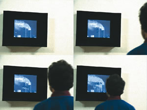 Bertrand “Under Attack” si identifica con lo shock più incredibile che abbia mai colpito l’umanità del nostro tempo: l’attacco alle torri gemelle. Ennio Bertrand da tempo usa i media tecnologici più avanzati con cui filtra le sue conoscenze e le sue emozioni. Under Attack infatti è la prima applicazione di un’innovazione interattiva che l’artista ha messo a punto. La tecnica che permette di interagire con le immagini video l’ha chiamata Remote Stills e stabilisce – tramite un computer ed un dispositivo ad ultrasuoni che rileva la posizione dello spettatore, collegati ad un software – un diretto e stretto legame con il pubblico. Lo spettatore infatti, a differenza di altri interventi interattivi in cui è lui a d effettuare le modificazioni, qui ne è come risucchiato e subisce le immagini del video che involontariamente si trova a condurre. Cioè gli spostamenti dell’osservatore nello spazio, determinano dei cambiamenti nella successione del racconto visivo. Avanzando, indietreggiando o fermandosi, il video ci segue e ci fa rivivere dall’interno e da protagonisti la tragedia di New York trasmessa dalla CNN sotto il titolo indimenticabile di “America under attack”.