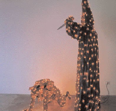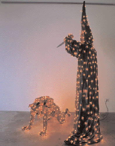 Attento alle problematiche e agli eventi devastanti che lacerano il mondo e l’umanità, Franco Scialò li traduce in personali riflessioni/opere che stanno tra la scultura e l’installazione. E’ una risposta alla sequela di spaventosi omicidi, stupri, pedofilia, distruzioni che la TV ci regala quotidianamente. Ma si dedica anche a tematiche più leggere, per lo più trapassate dall’ironia. La sua caratteristica inconfondibile (che nelle ultime opere è venuta meno, sostituita da altre modalità strutturali, affidate a materiali di recupero soprattutto stoffe) è l’illuminazione che queste opere subiscono, come alberi di Natale, trasformandosi da tragedia truculenta in spettacolo. Ma non solo, l’illuminazione prodotta da innumerevoli minuscole lampadine sparse su tutta l’opera, infonde un’atmosfera di calore, un soffio catartico e sublimante, con la complicità anche di un ludico sorriso. Superano la realtà del male ed aleggiano verso una realtà di sogno. Succede anche a “Questo è il tuo sacrificio” per cui l’atto assassino dell’uomo incappucciato (un rituale satanico?) cede in violenza sotto l’effetto dell’illuminazione radiante.