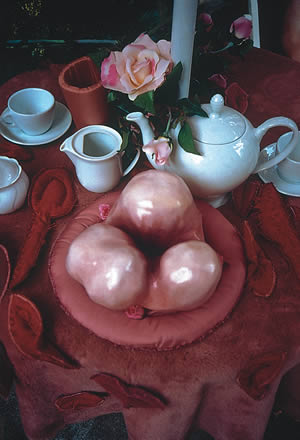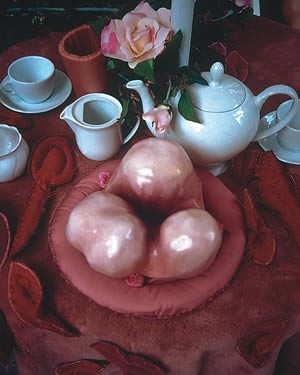 Ai languori di un eros dell’ambiguità sessuale, fa eco anche il celebre duo Pierre et Gilles qui presente con l’opera “Didier”. Un concentrato di lucida svenevolezza, di glamour che trascende nel kitsh, di patinato immaginario popolare in cui spesso risuona l’incanto d’Oriente, di stucchevole pietismo, di leggiadra blasfemia – dove si sprecano le lacrime, i sorrisi da innamorati anni ’30 – di falsi rapimenti estatici, di macchie di sangue troppo smaccate su casti visi incorrotti, di preziose cornici anticate, tutto ciò costituisce il loro inconfondibile vocabolario della finzione. Con in più, nelle opere recenti, un’accentuazione notturna che infonde un alone di mistero. Ma il corpo e l’eros ad esso connesso conoscono ancora altre varianti. Antonella Bersani fissa la sua attenzione su di un solo apparato anatomico, anche se le sue sembianze possono essere allusive di altre parti corporee; lucide, rosee, carnose, a protuberanze con una fonda cavità nel centro, che l’autrice definisce “corpi”, sono vulve. Le sparpaglia dovunque, dentro scatole preziose, tra i cuscini, sul tavolo tra i fiori, nel carretto siciliano. Cloni di una realtà ineludibile che circola dovunque, pensiero dominante, ironia di un’ipersessualità iperesibita e perciò declassata. Commento dunque divertito di un comportamento sociale che diviene paradosso.