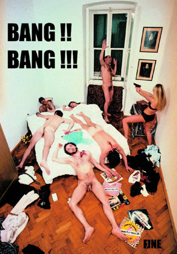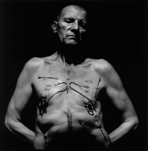 E la presentazione del privato raggiunge l’esasperazione fino all’esibizionismo nei racconti tra foto, collages, pittura, performances di Elke Krystufek. Un bisogno estremo di confessare quello che ciascuno tiene per sé, cercando la definizione di un’identità femminile, dagli aspetti androgini, spesso violenti, che sfugge e si trasforma. Il critico Gianni Jetzer ha detto che rappresenta l’ideale profanato di una star del III millennio. Il suo è una sorta di diario visivo intimo, che sale dall’inconscio, in cui si ribadisce l’abbraccio arte-vita. E l’eros diviene sofferenza che sostituisce e si fa piacere nell’allucinato immaginario sado-maso di Goran Bertok. La tensione fino al disturbo si alimenta di sconvolgenti visioni in b/n, dove il biancore delle carni martoriate si esalta nel nero dello sfondo, nelle ombre spesse da illuminazione radente che accumulano violenza sulla violenza di catene, maschere di cuoio, orrendi marchingegni di autosofferenza. L’autoerotismo si traduce in desiderio di sacrificio e morte, evocando certi mistici medioevali che volevano ripetere su di sè la passione di Cristo.