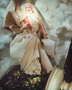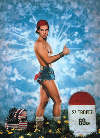 Pierre et Gilles qui presente con l’opera “Didier”. Un concentrato di lucida svenevolezza, di glamour che trascende nel kitsh, di patinato immaginario popolare in cui spesso risuona l’incanto d’Oriente, di stucchevole pietismo, di leggiadra blasfemia – dove si sprecano le lacrime, i sorrisi da innamorati anni’30 – di falsi rapimenti estatici, di macchie di sangue troppo smaccate su casti visi incorrotti, di preziose cornici anticate, tutto ciò costituisce il loro inconfondibile vocabolario della finzione. Con in più, nelle opere recenti, un accentuazione notturna che infonde un alone di mistero.