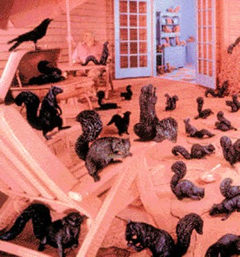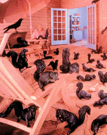 Sandy Skoglund è la regina delle trasformazioni ambientali con le sue invasioni di frotte di animali, gatti, scoiattoli, orridi serpenti, mentre l’umanità ignara o inconsapevole continua a svolgere indisturbata le sue mansioni di sempre. Le sue fotografie, distintive tra tutte, sono il frutto di laboriose “mise en scene” per costruire l’incubo domestico che ci assale a nostra insaputa., Simboli, senza traumi, di malesseri e fobie, materializzano dissociazioni ed incongruenze che , nei lavori più recenti si accentuano con lo iato tra figure reali capovolte ed immagini fittizie – cloni o replicanti di altri mondi – come in “Breathing Glass” (2000). Un’ulteriore svolta sta nella pioggia di popcorn che ricopre personaggi reali e maquettes per trasformarsi in fotografie dall’algido clima invernale oppure in concrete installazioni.